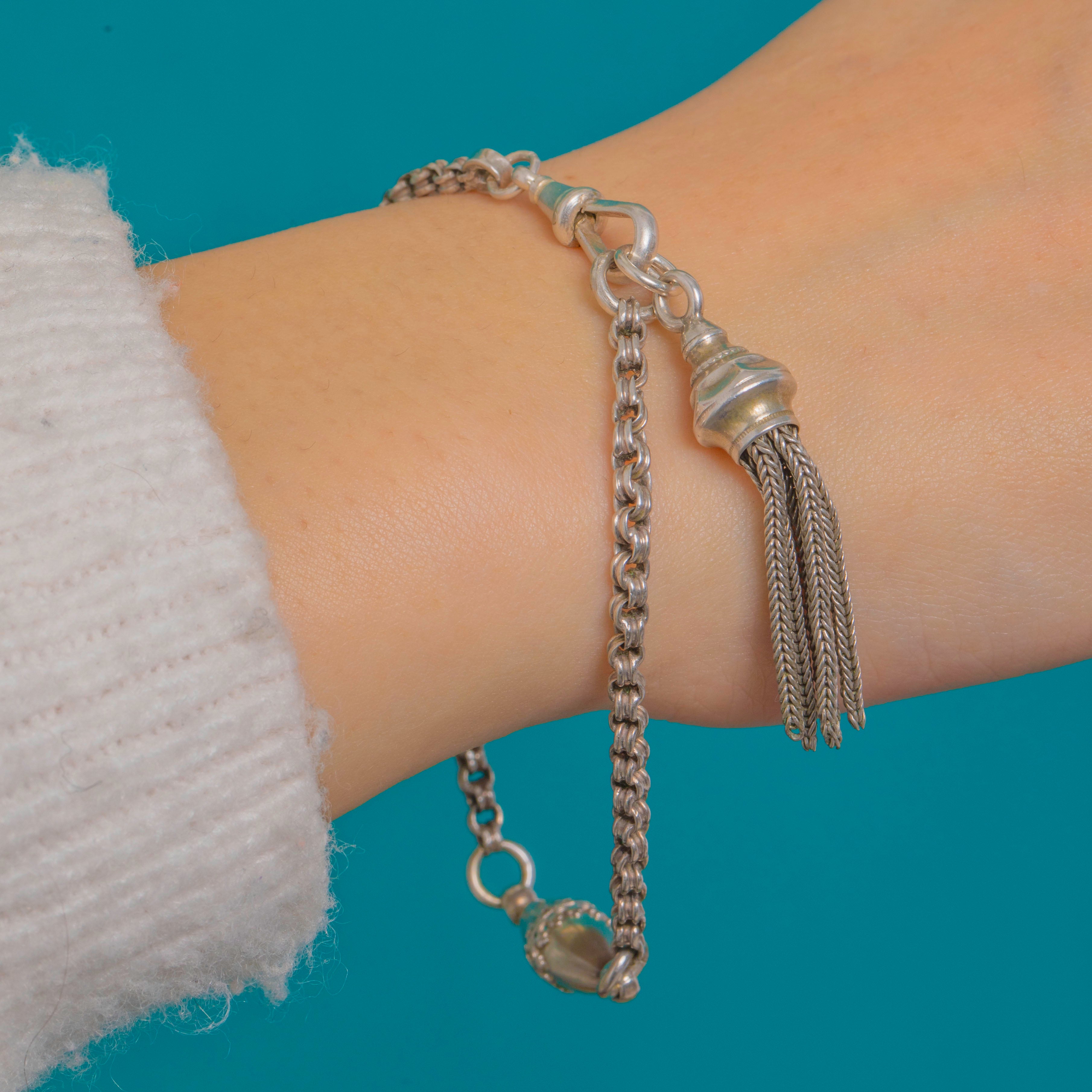 Classic yet playful, the bracelet fastens with a traditional dog clip and features refined links for comfortable, everyday elegance. Wear the tassel on or off to suit your mood—either way, this quintessential Victorian flourish adds effortless charm to any ensemble.
