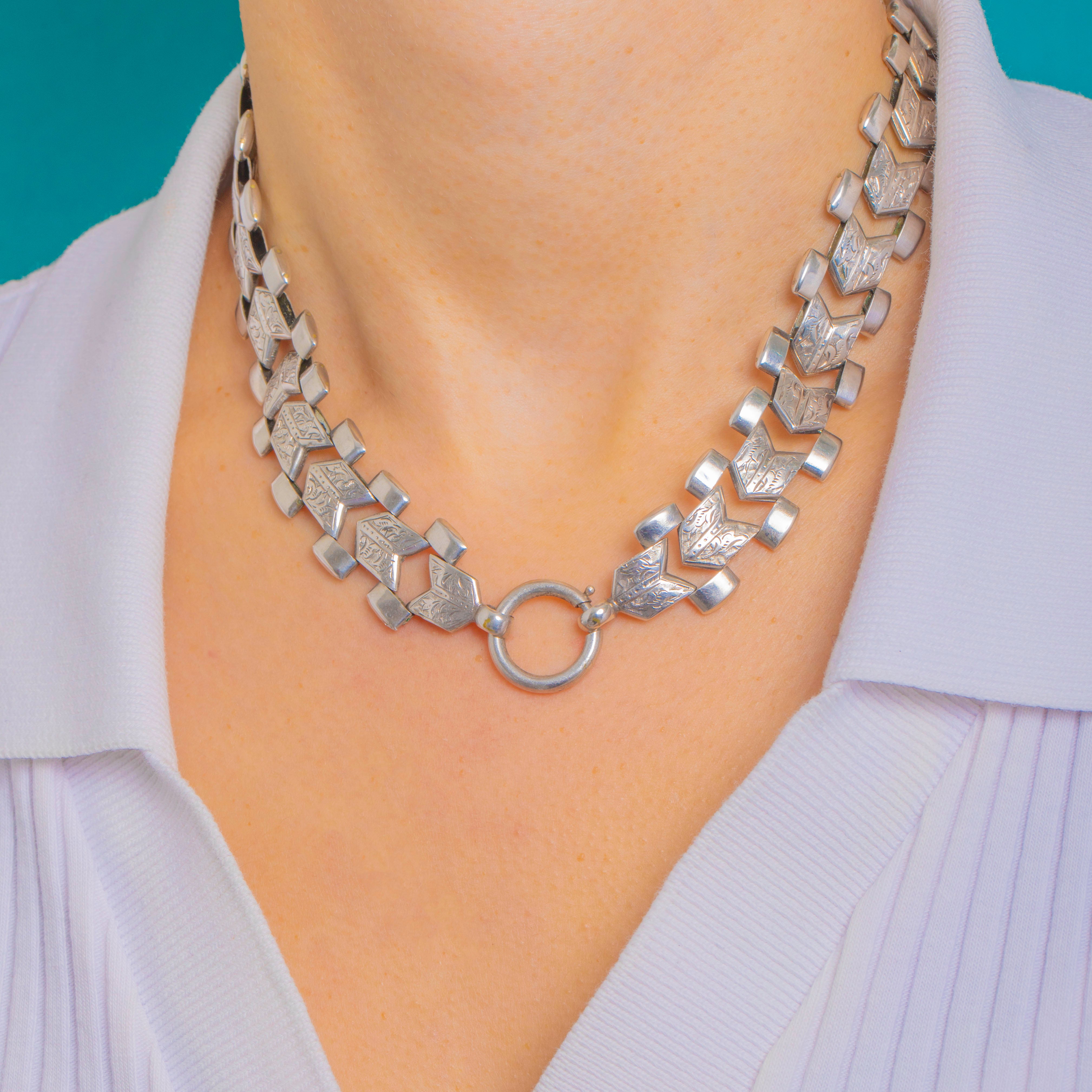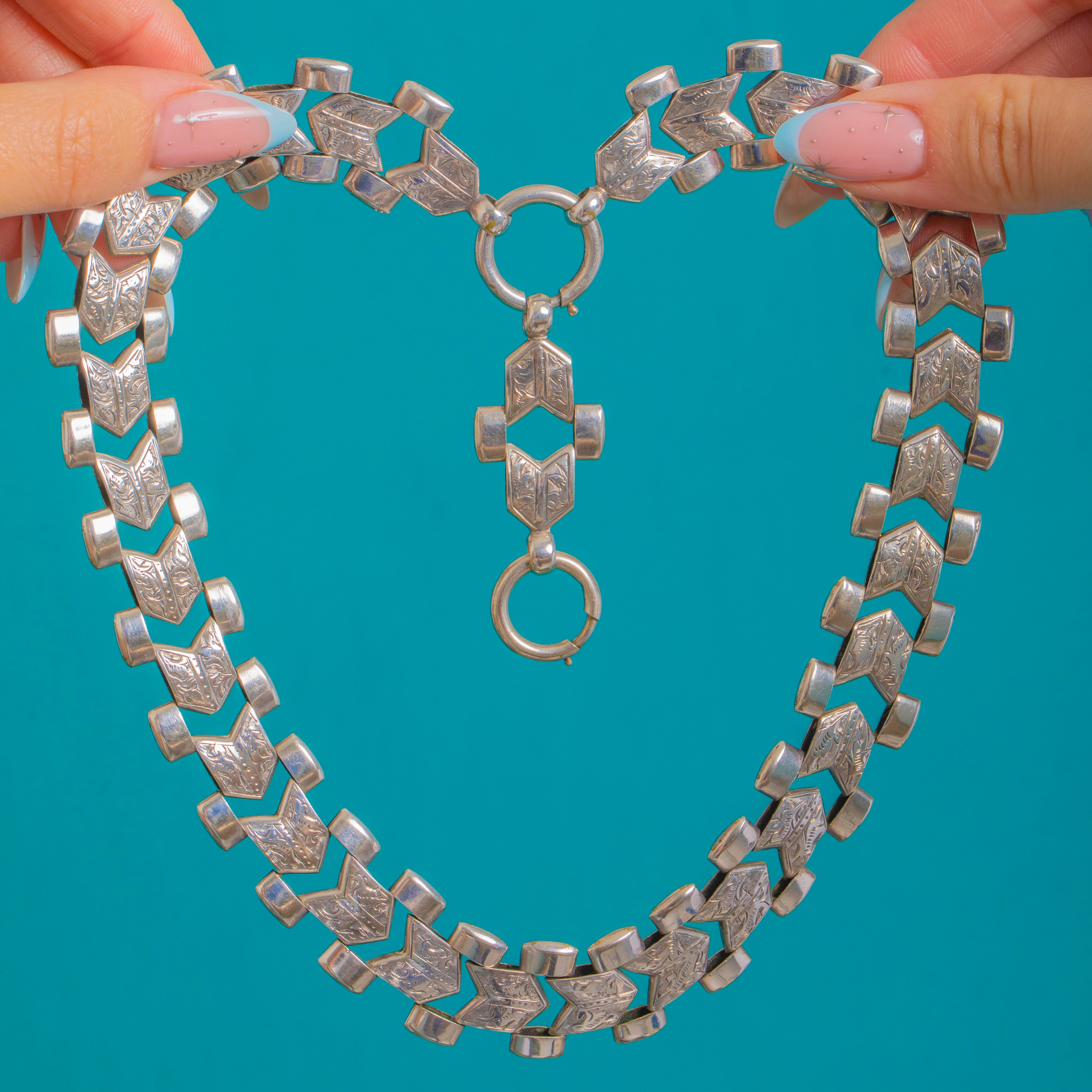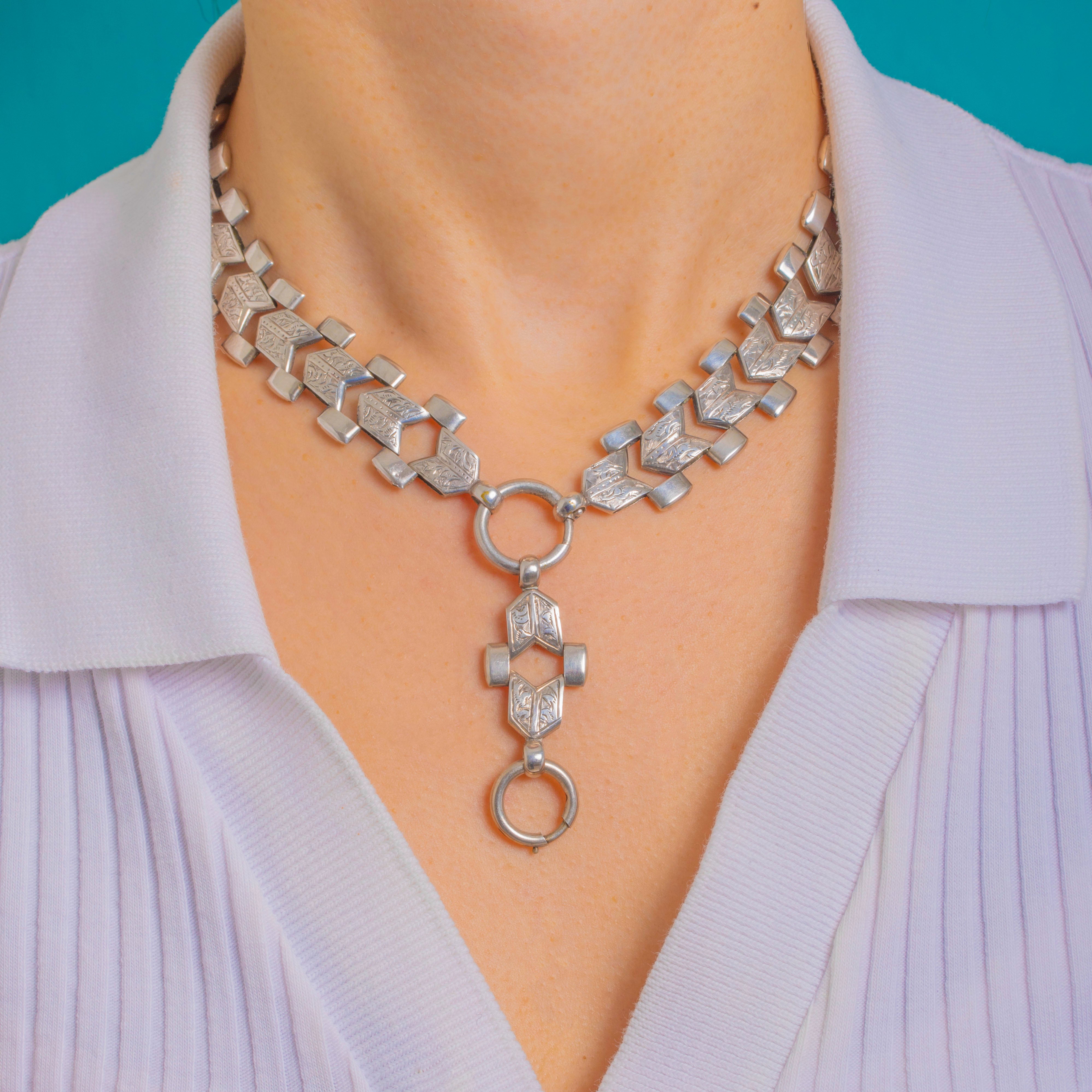 Bold, architectural and unmistakably Victorian, this Sterling Silver book-chain collar dates to circa 1880. The wide articulated links alternate between bright-cut foliate-engraved chevron plaques and smooth tubular spacers, creating that classic “book chain” rhythm with a sleek, geometric edge. An oversized front bolt-ring connects a short articulated drop ending in a second oversized bolt-ring—perfect for suspending a favourite locket or pendant, or wearing strikingly on its own.