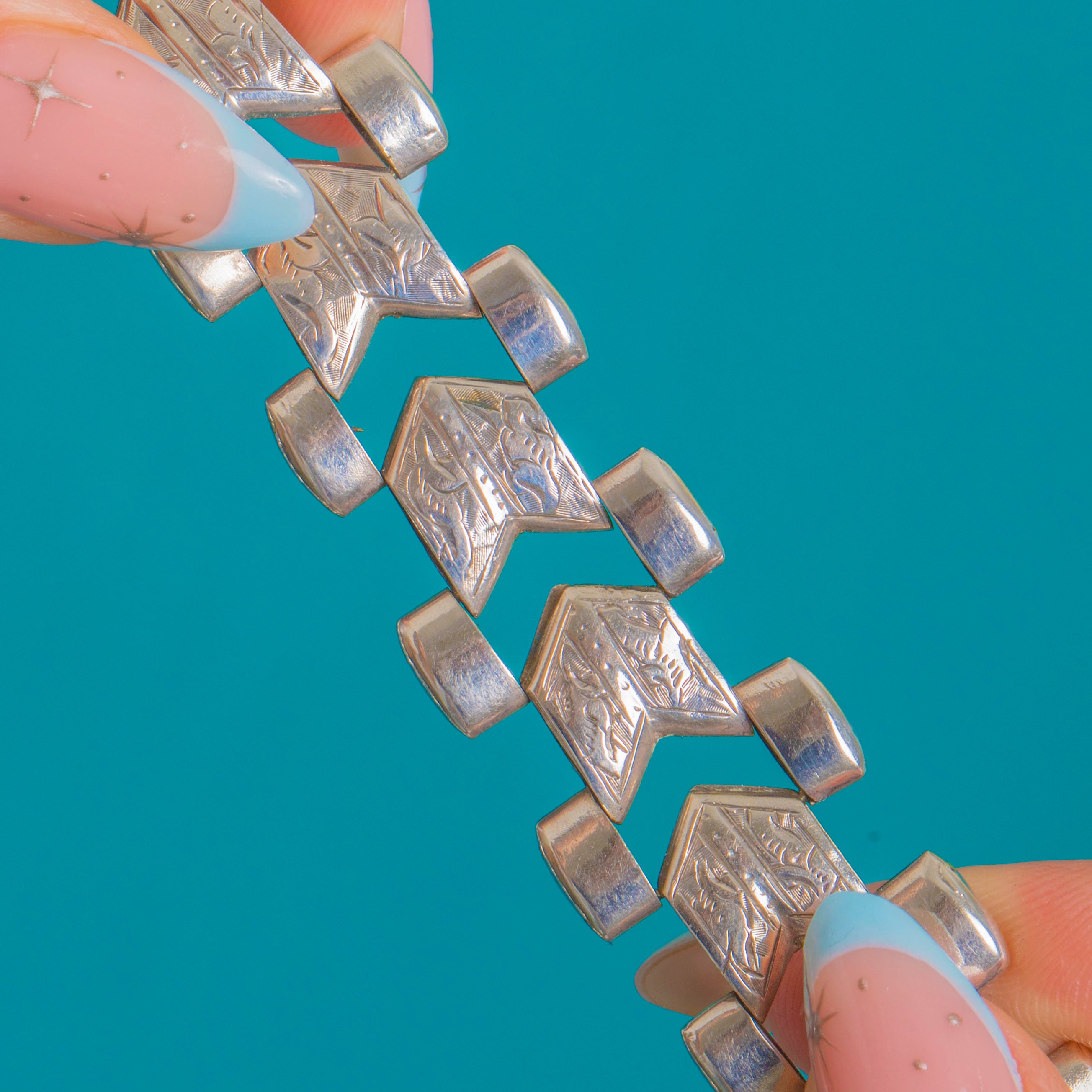 EXCELLENT: The Silver surfaces show light, even wear and a gentle patina, with the bright-cut engraving still crisp and only slightly softened with age. The articulation is smooth, links align well and both bolt-rings fasten securely. No visible repairs or alterations, well cared for and ready to wear.