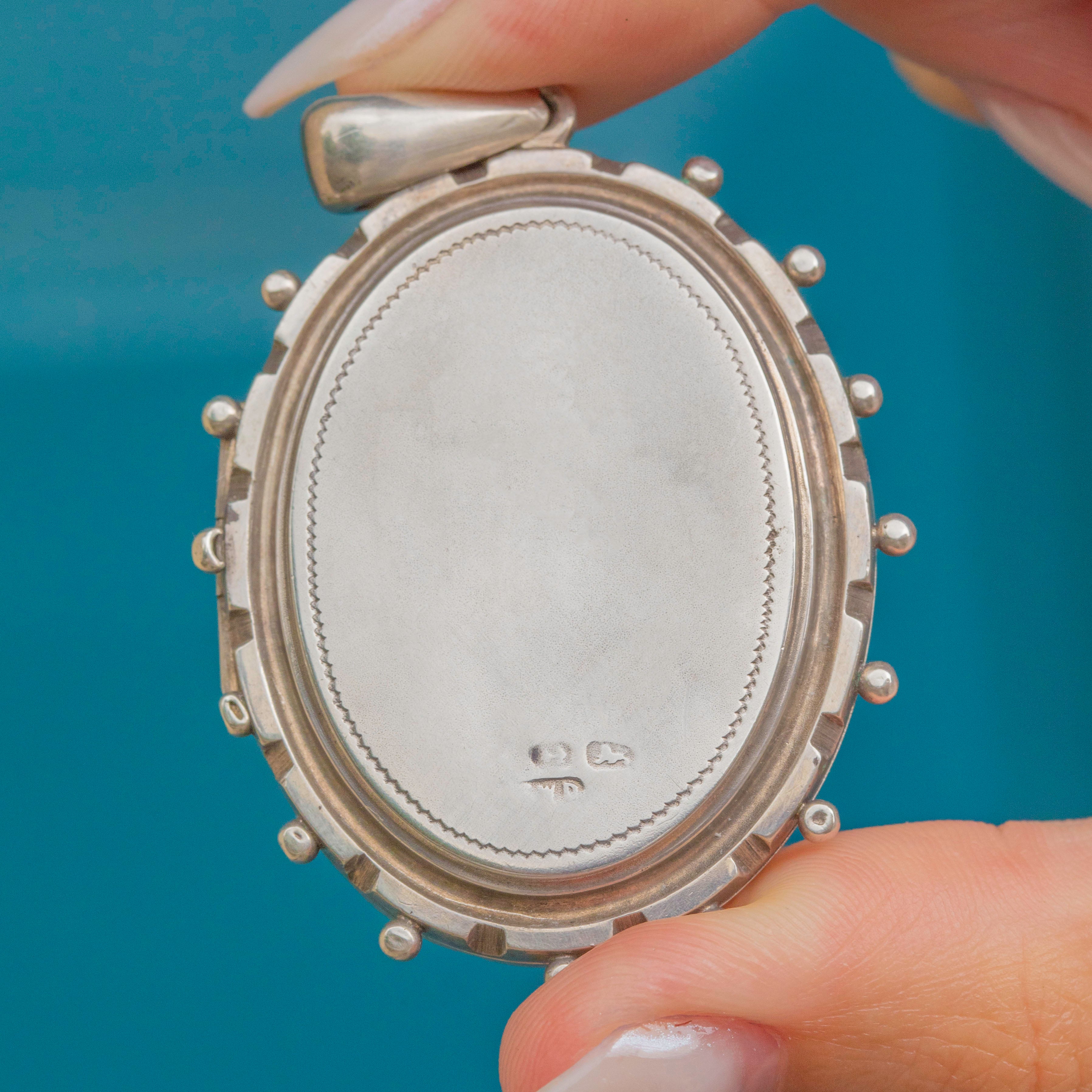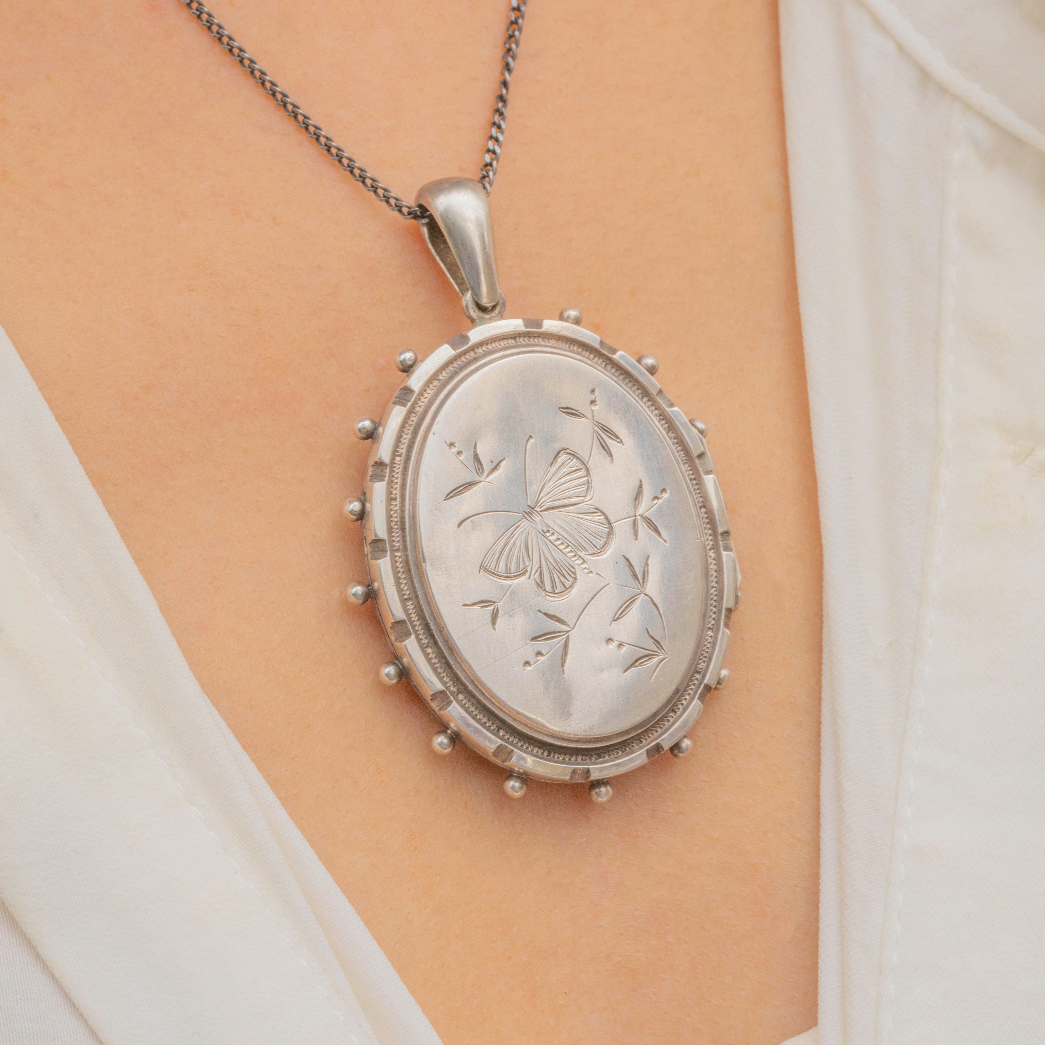 Victorian Sterling Silver Engraved Butterfly Oval Locket, c.1879