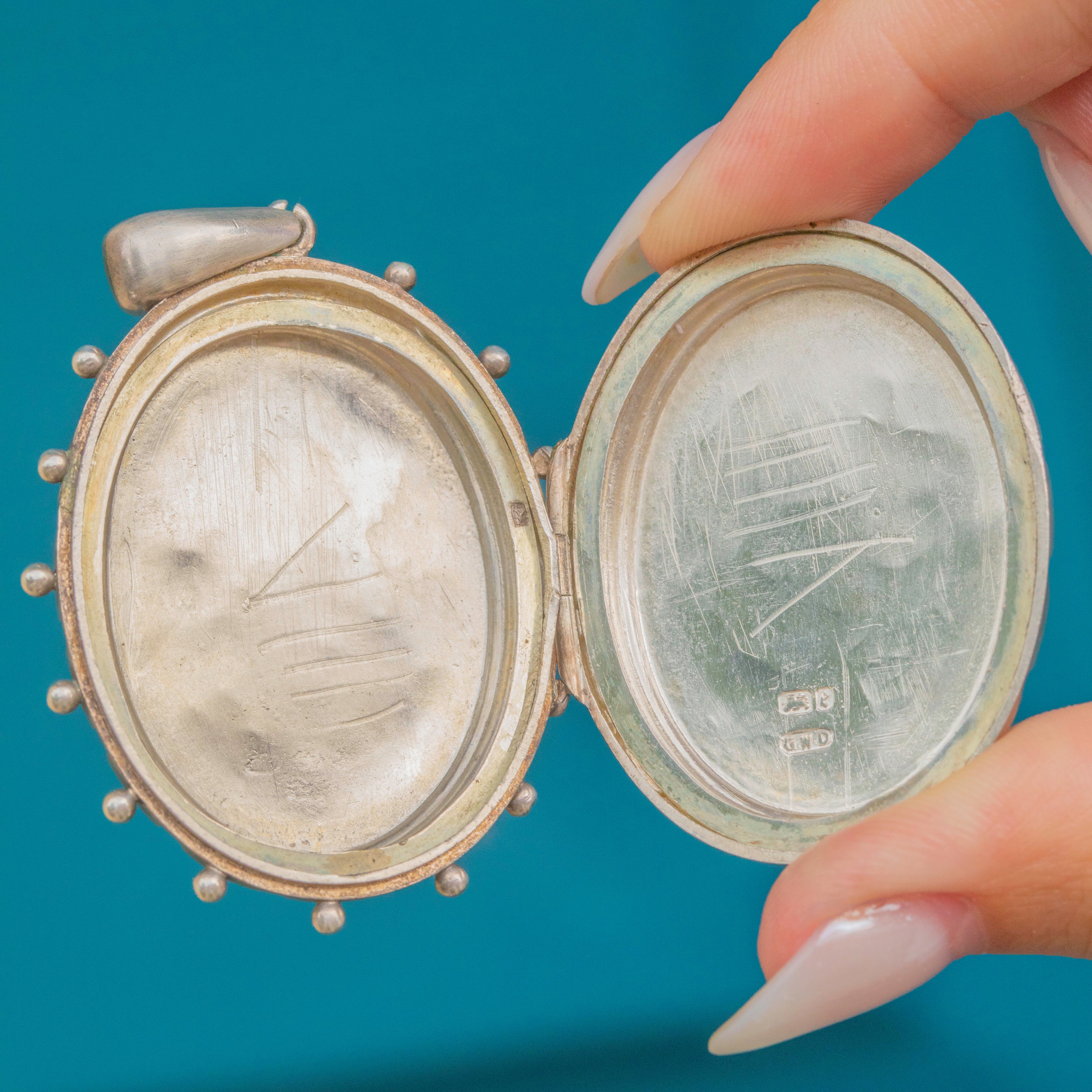 VERY GOOD. The Silver is bright and the engraved details are crisp, with only two thin scratches on the front, noticeable under close inspection. The back of the locket has some faded hallmarks, and the Silver has some dings to note. The inside of the locket is shiny, with two frames present. The beaded detailing has lasted really well, with only minor wear to note.