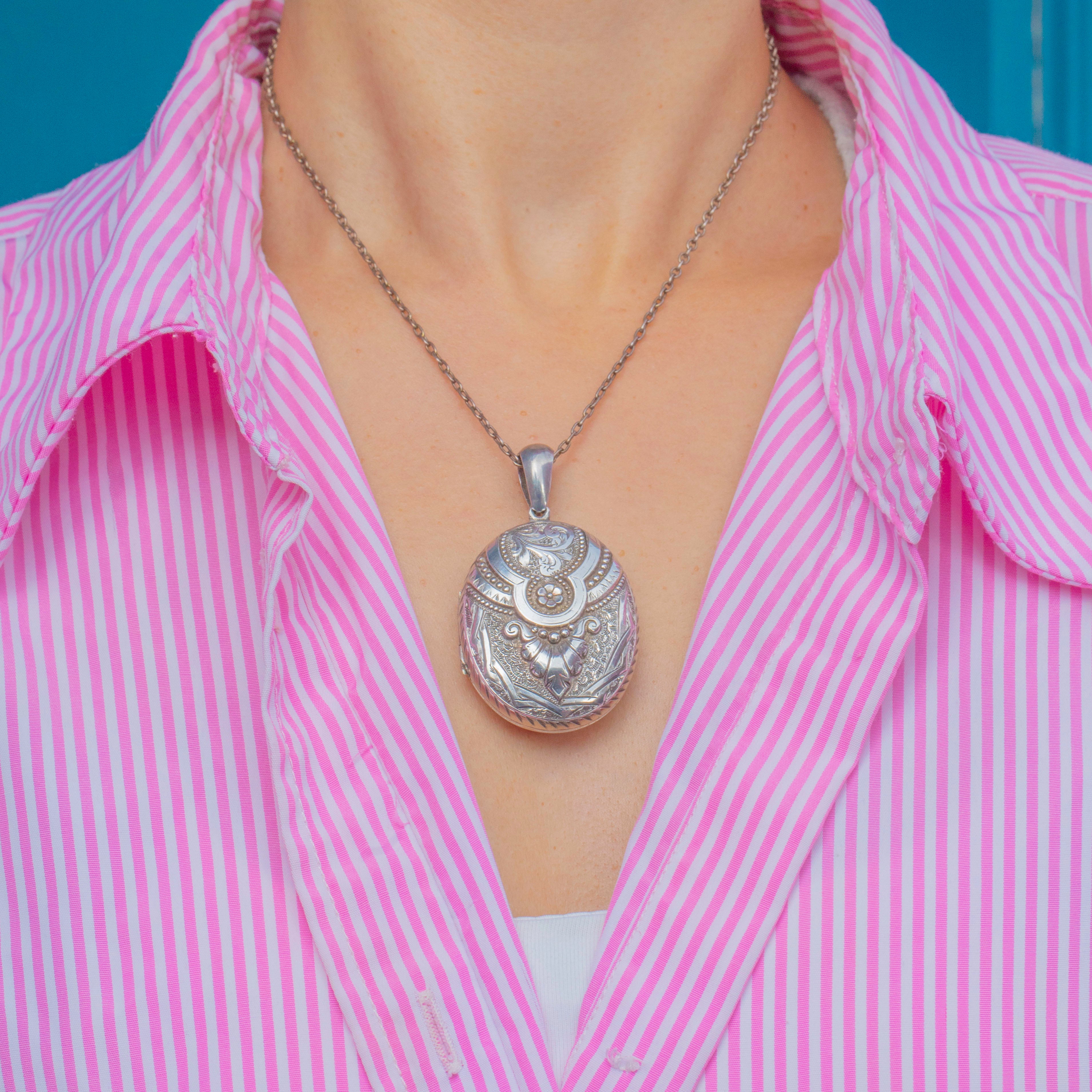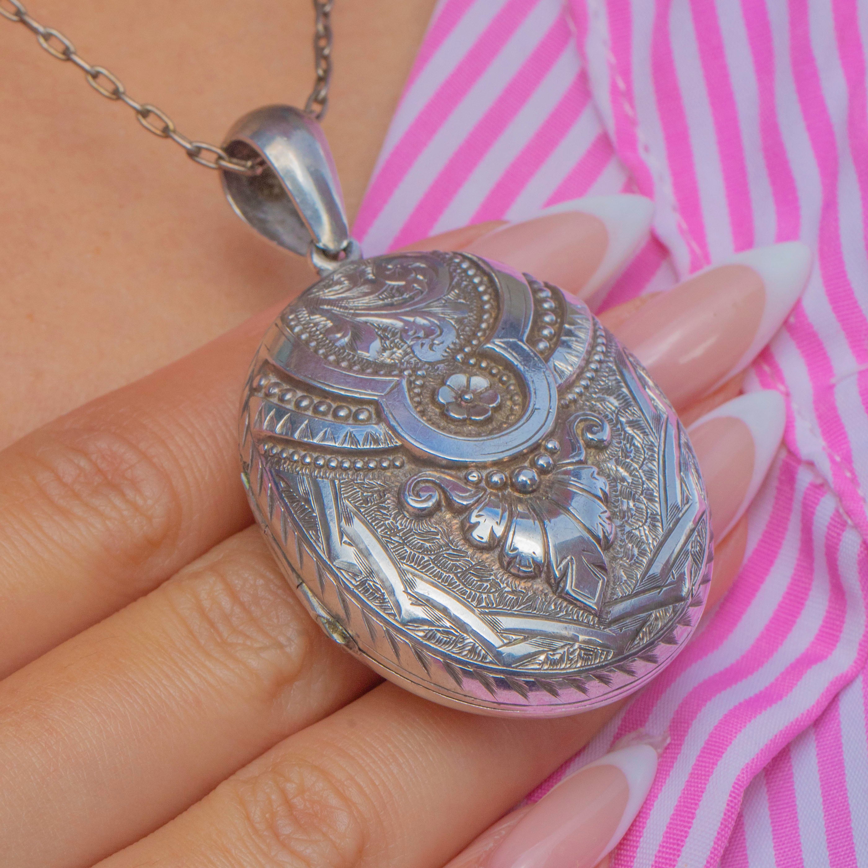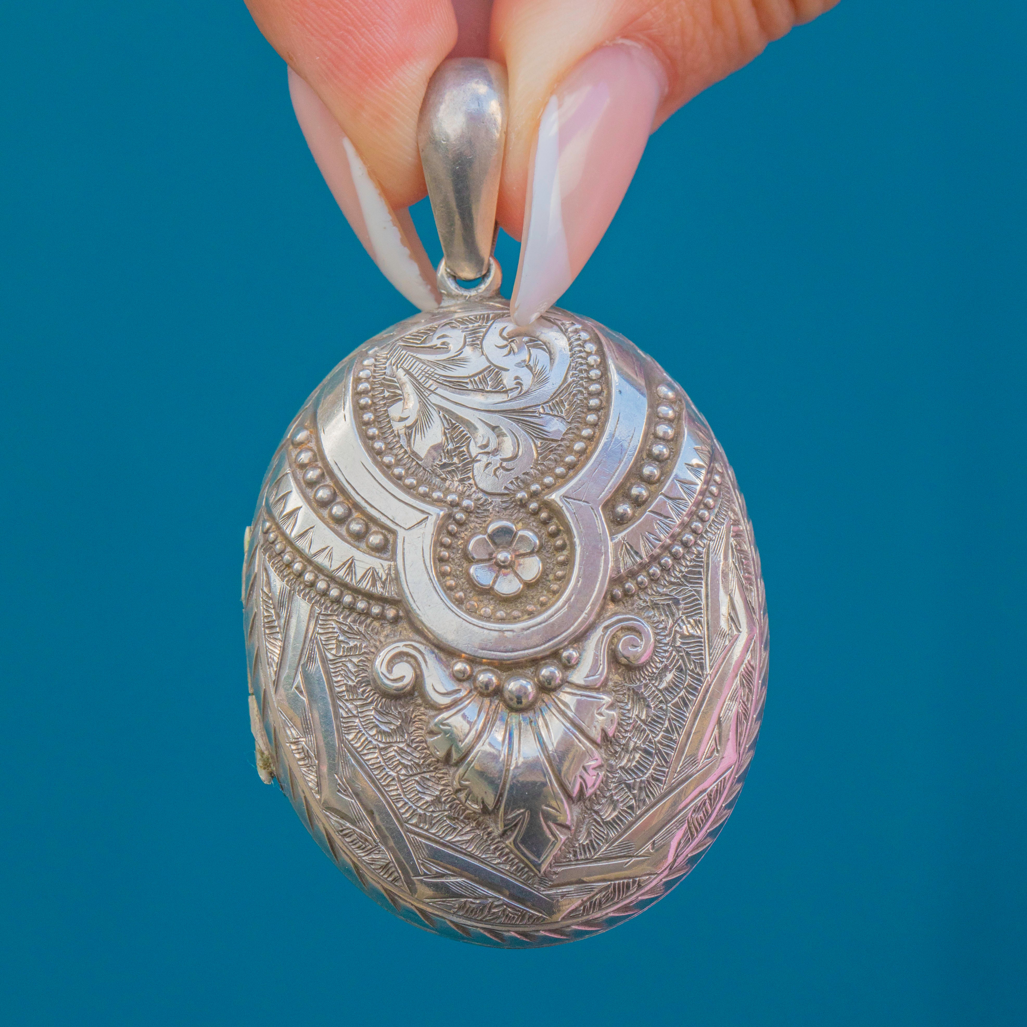 Crafted circa 1890, this striking Victorian Aesthetic locket is crafted in bright Sterling Silver. Its bold oval shape is beautifully embossed and engraved with ornate geometric and foliate detailing, a perfect example of the Aesthetic movement’s love of intricate surface decoration. The design includes a central flower motif framed by beaded accents and elegant scrollwork, giving the piece both texture and depth.