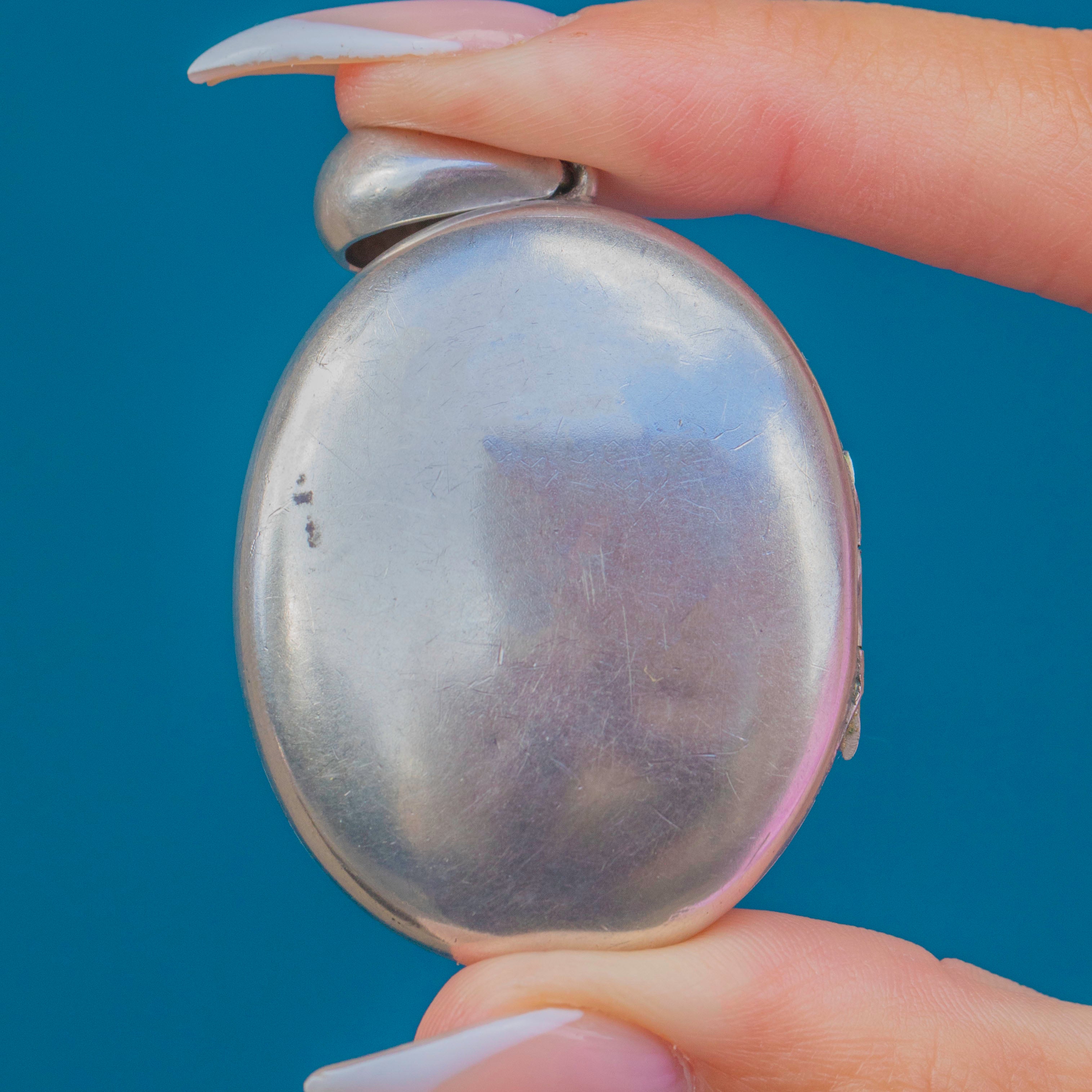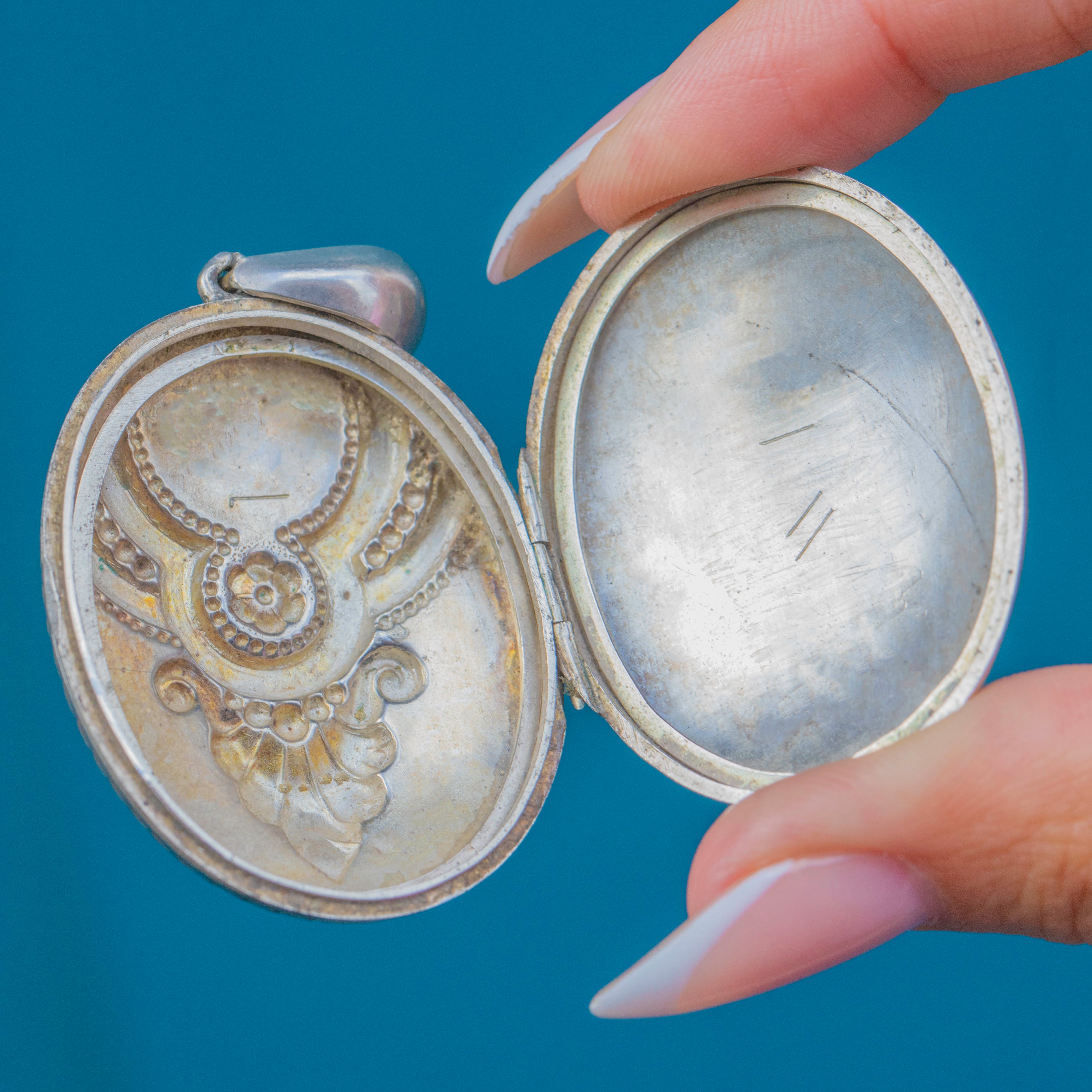 EXCELLENT: The locket is in excellent condition with no dings or damage. The embossed and engraved design remains crisp and well-defined. The Silver surface shows only the lightest signs of wear consistent with age, and both internal frames are present.