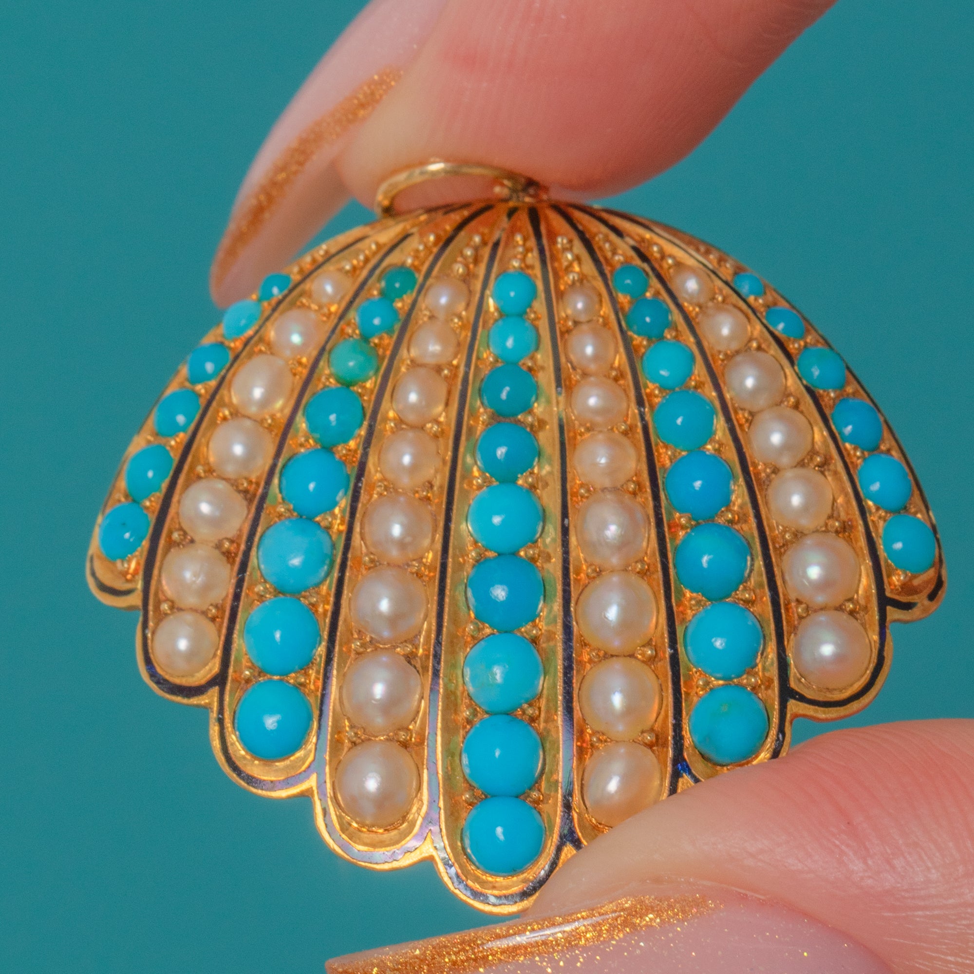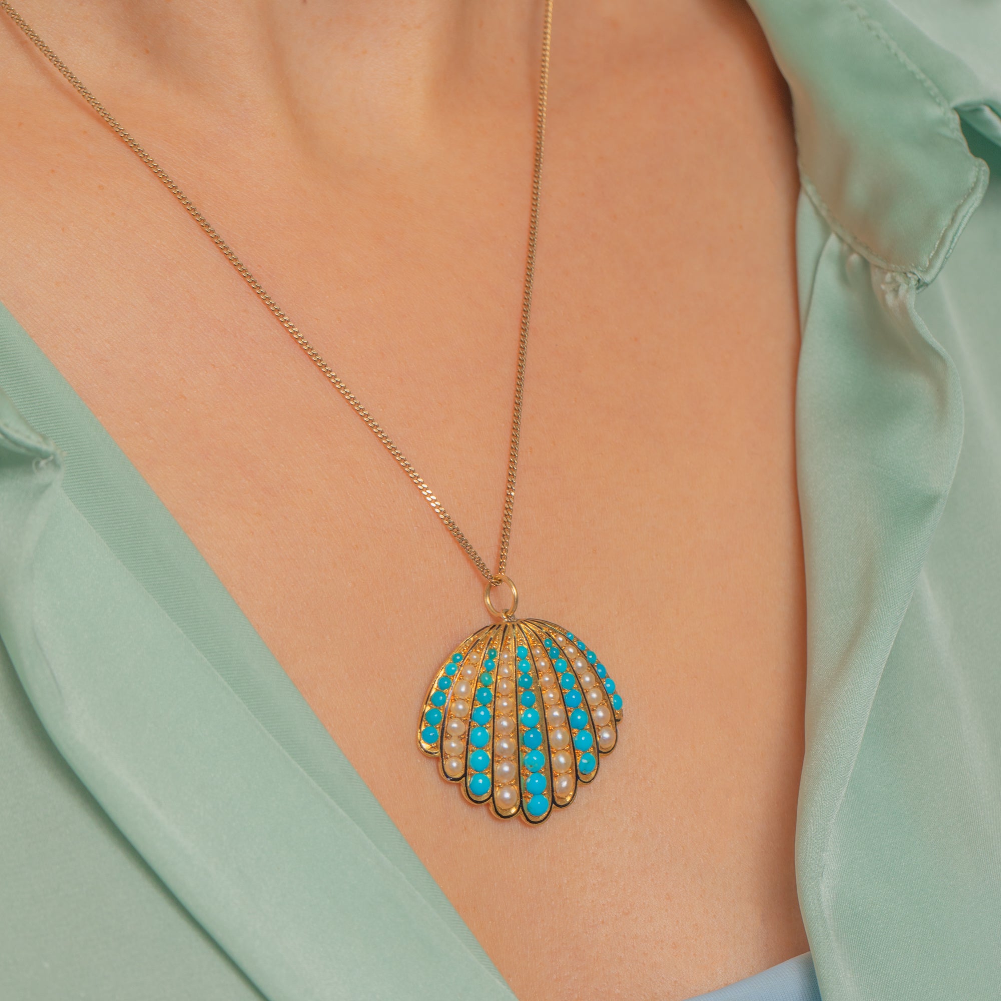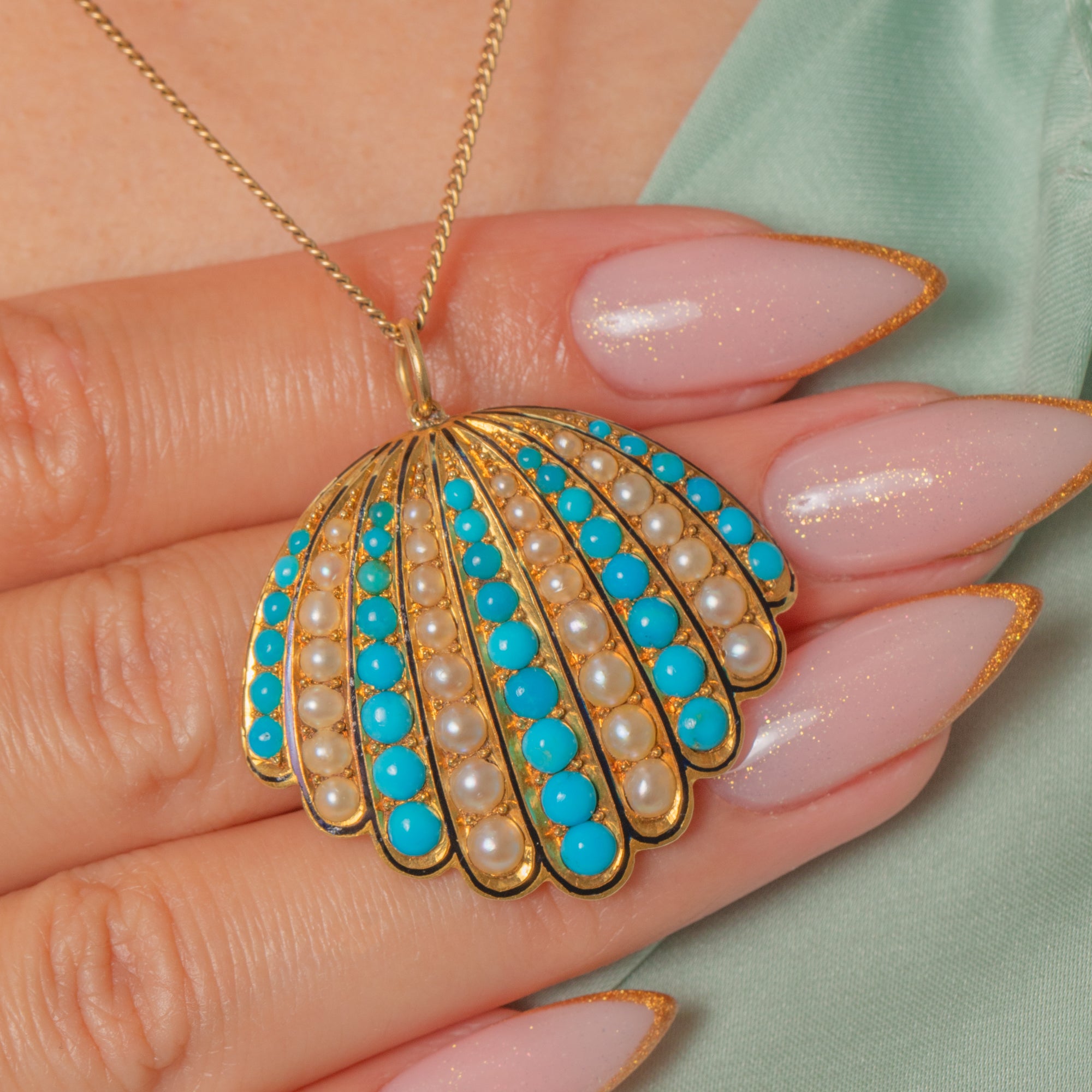 This romantic antique Victorian clamshell pendant is crafted in rich 15ct Gold, with its scalloped form meticulously set with alternating rows of bright Turquoise and creamy natural Pearls, framed with a fine border of glossy Black Enamel for striking contrast. The result is a piece that feels both regal and playful — a perfect example of Victorian sentiment and craftsmanship.