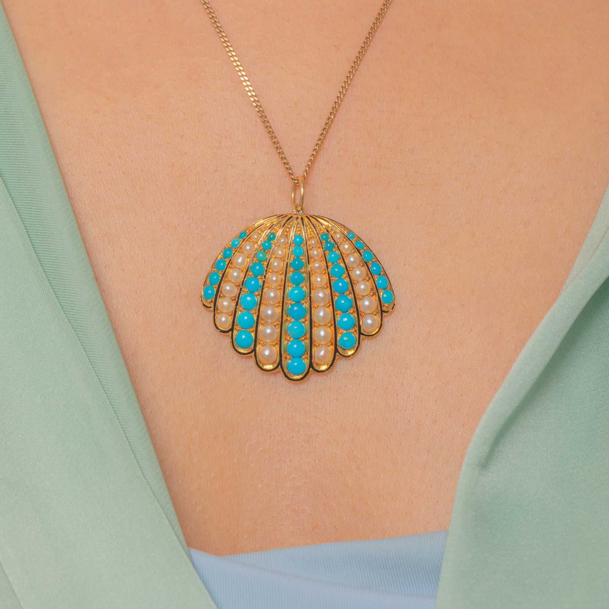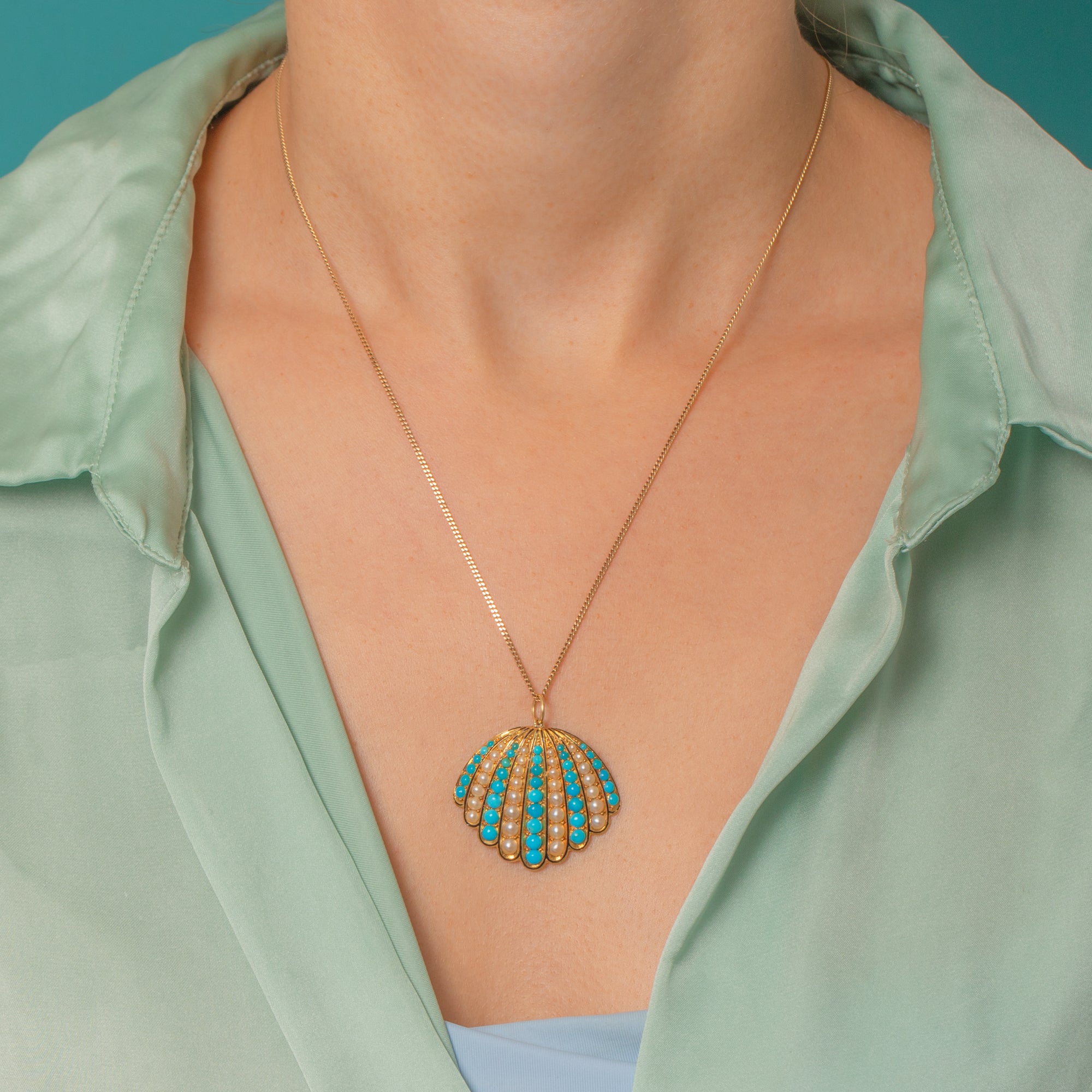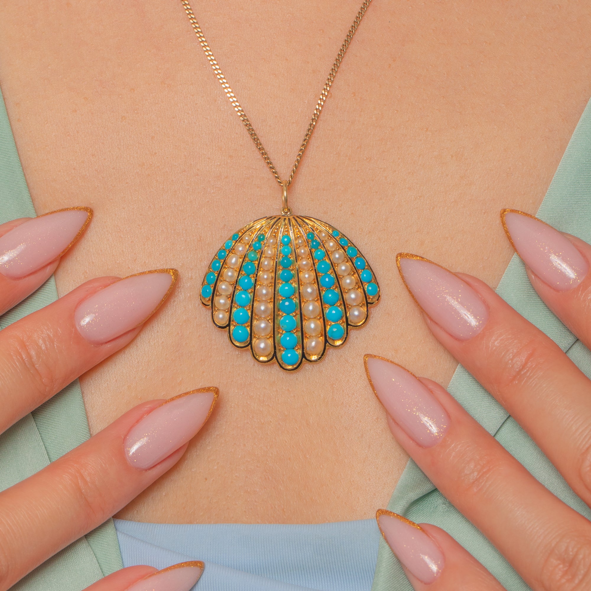 This romantic antique Victorian clamshell pendant is crafted in rich 15ct Gold, with its scalloped form meticulously set with alternating rows of bright Turquoise and creamy natural Pearls, framed with a fine border of glossy Black Enamel for striking contrast. The result is a piece that feels both regal and playful — a perfect example of Victorian sentiment and craftsmanship.