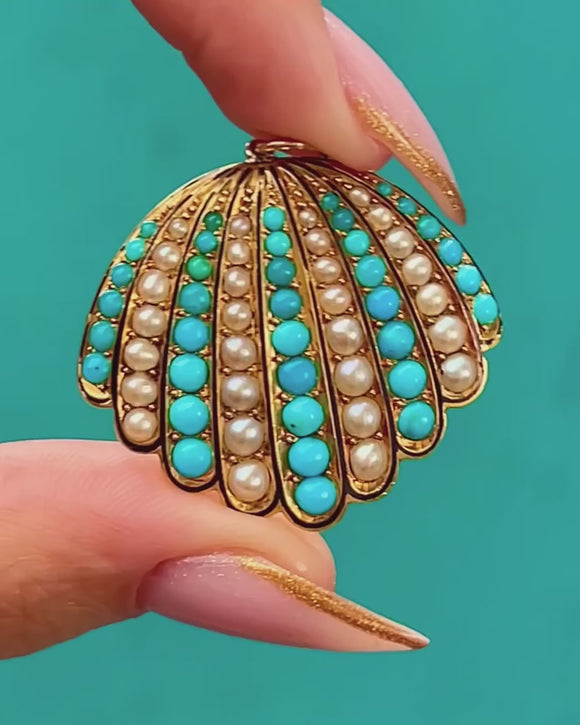 Antique 15ct Gold Turquoise, Pearl & Black Enamel Clam Shell Pendant