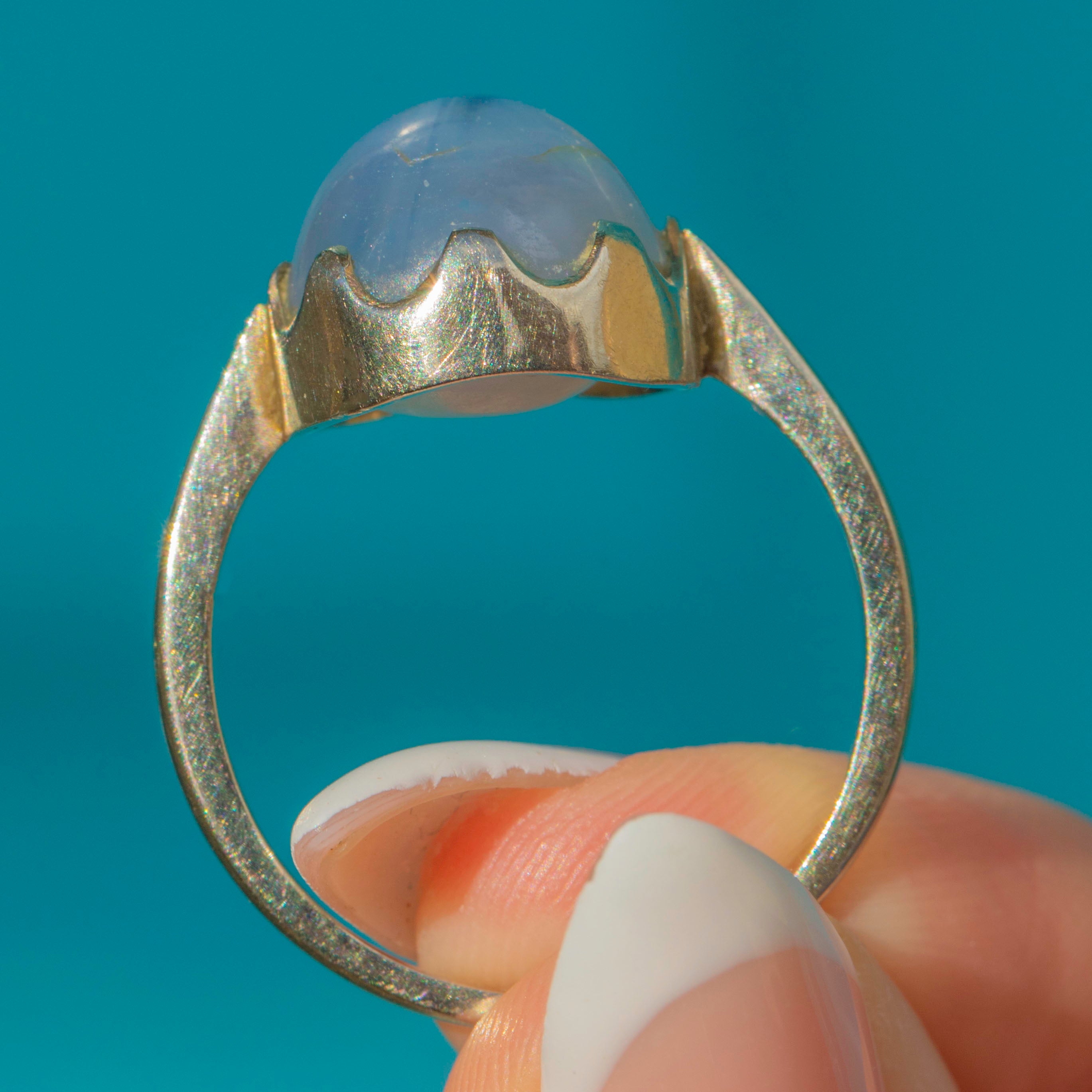 A glowing Vintage Star Sapphire ring in 14ct Gold. The high-domed cabochon shows a crisp six-rayed asterism that rolls beautifully across the stone in the light, framed by scalloped claws and a clean, minimal shank. Classic, wearable, and effortlessly striking.