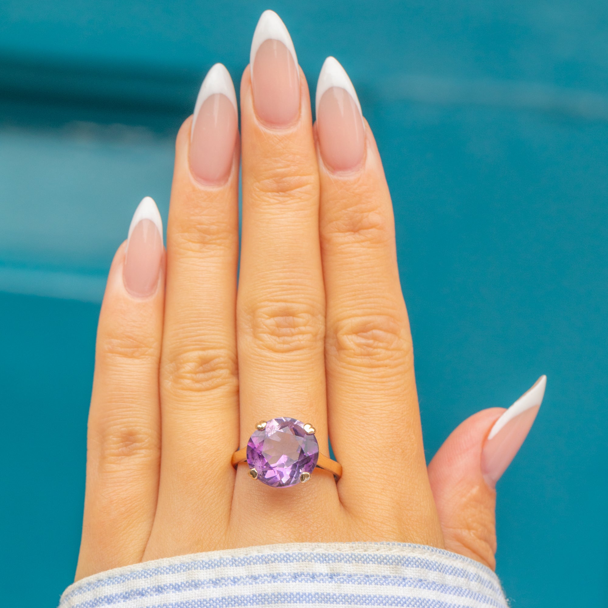This Vintage Amethyst ring makes a striking statement with its bold simplicity. The star of the piece is a vivid Amethyst weighing 3.78 carats, with a round brilliant cut and secured in a classic four-claw setting.
