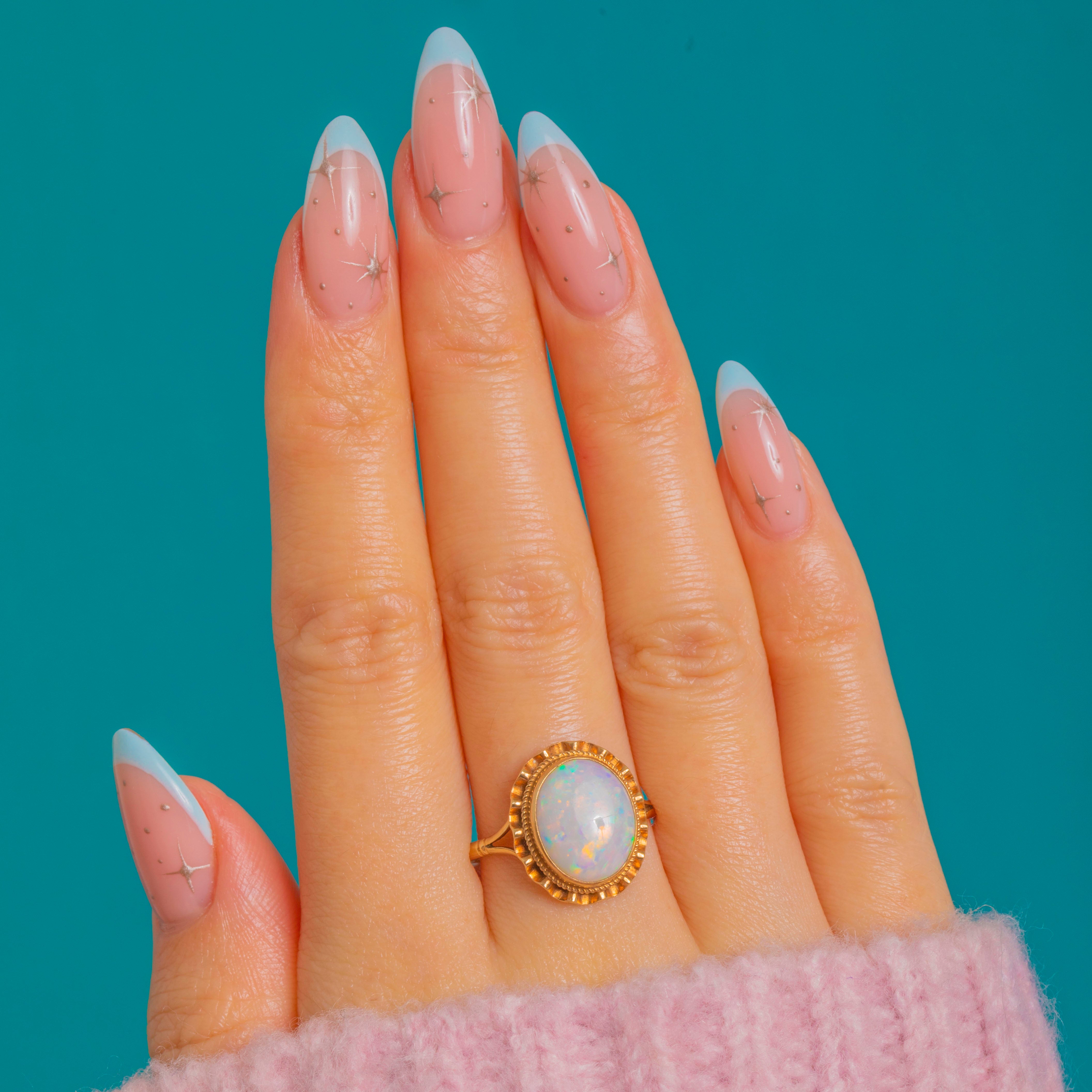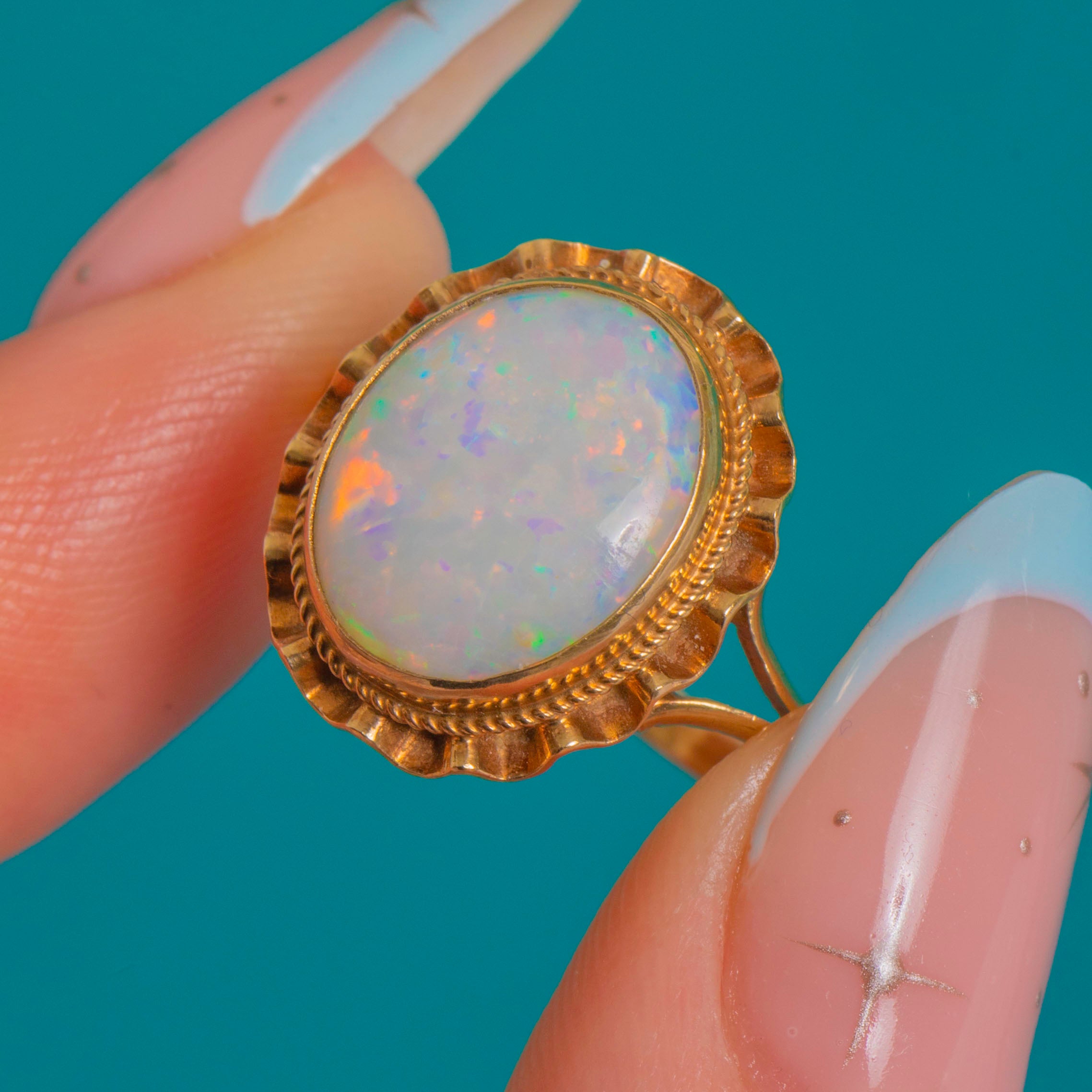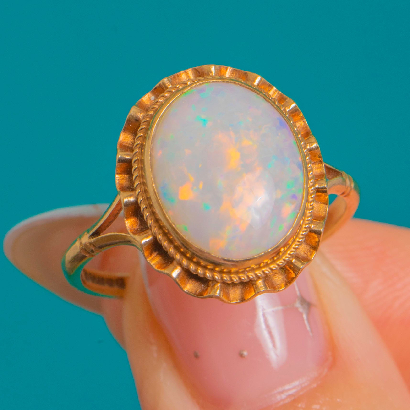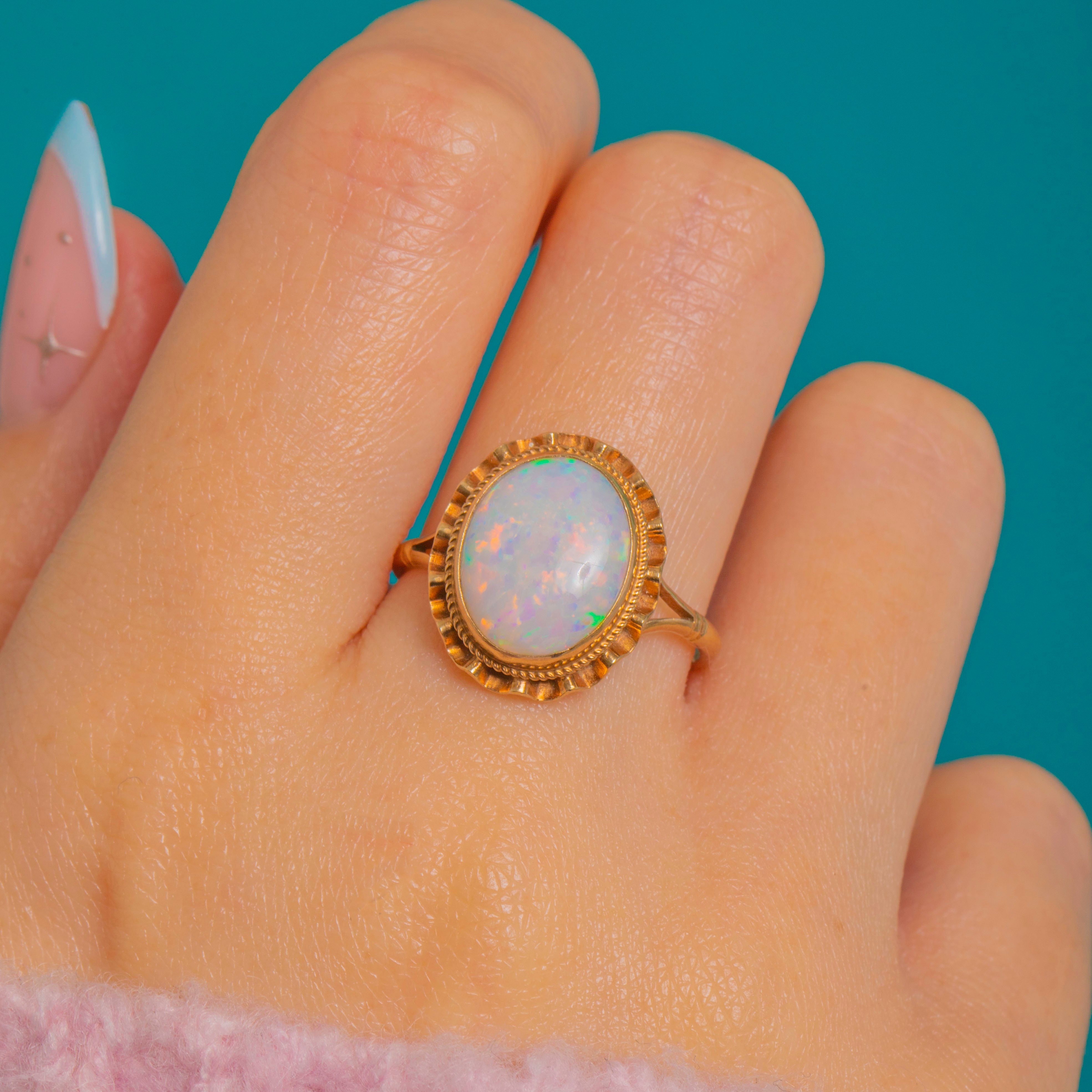 Alive with opalescent fire, this Vintage 9ct Gold ring showcases a natural, solid Opal cabochon glowing with flashes of green, orange and red. The oval gem is wrapped in a refined rubover bezel and framed by a rope border and scalloped edge, creating a graceful rosette or “ballerina” feel. Slim split shoulders and an elevated, open gallery keep the silhouette airy and romantic.