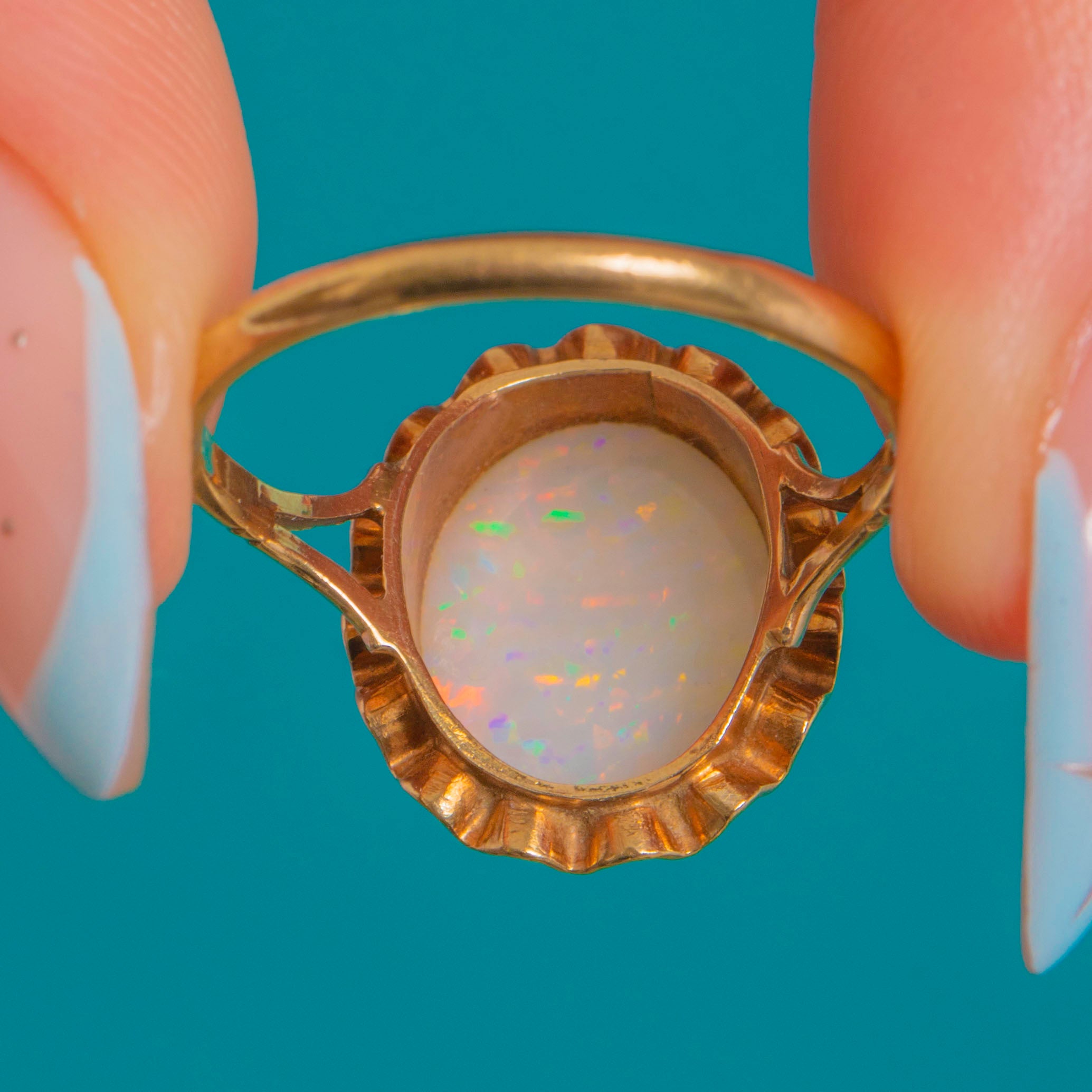 EXCELLENT: The Opal presents beautifully with lively play-of-colour and only minor surface rubs visible under close inspection; no chips or cracks observed. The Gold shows light, sympathetic wear with a warm patina; settings are secure and the shank remains round and even. No visible resizing or restoration marks.