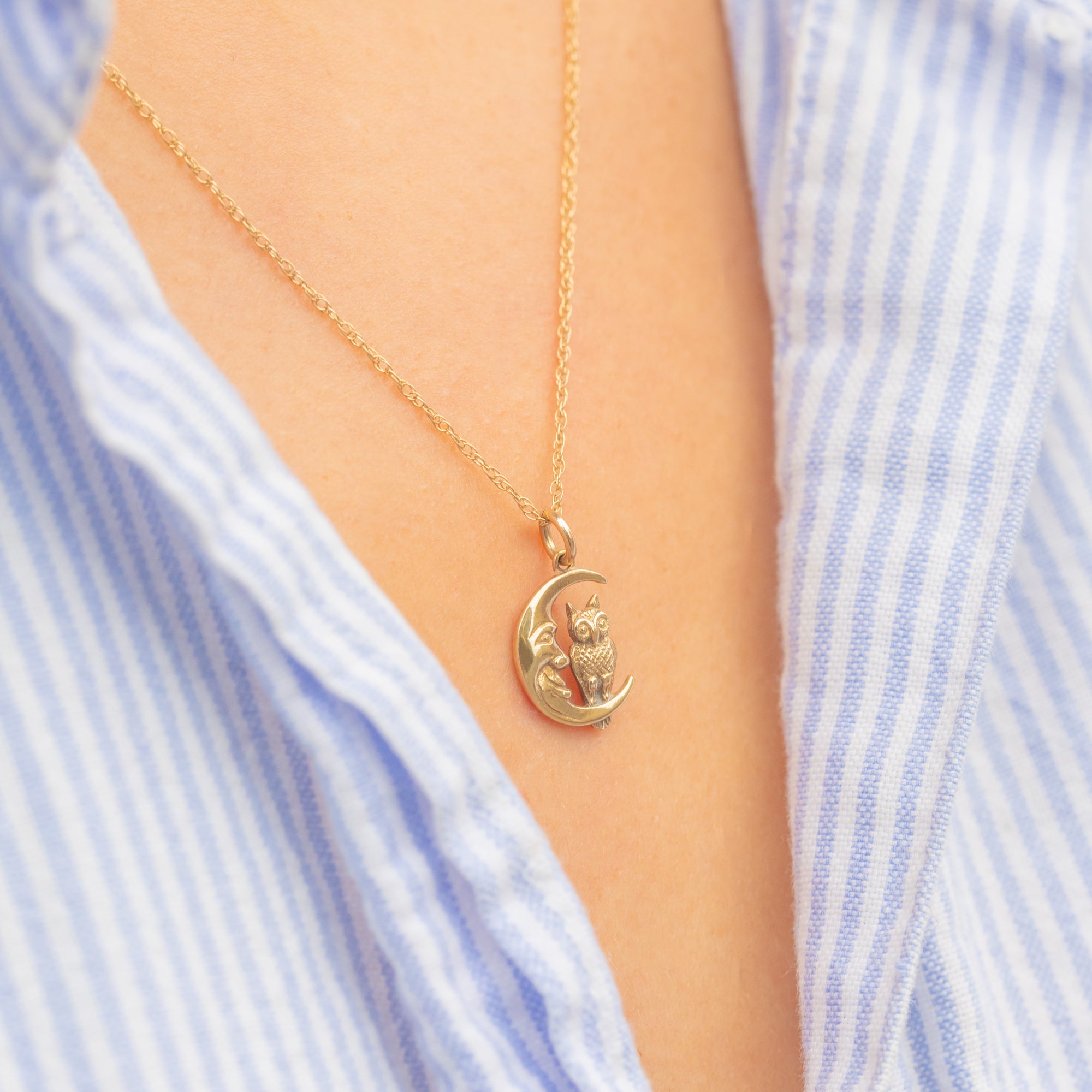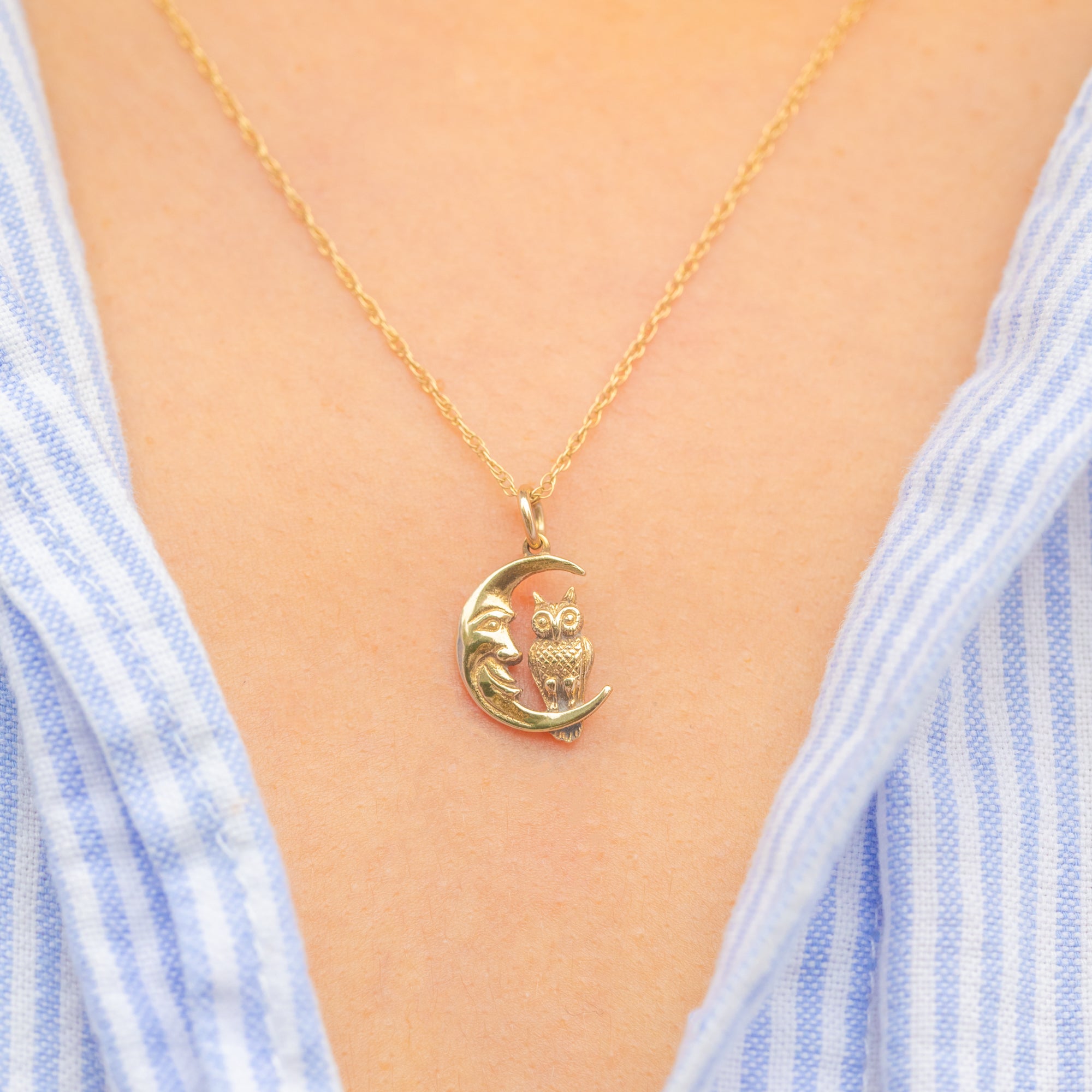 EXCELLENT: Both the charm and chain are in superb condition. The Gold surfaces are bright with no dents or scratches, and the owl and moon details are crisp. The chain is strong and secure, making this necklace ready to wear and enjoy.