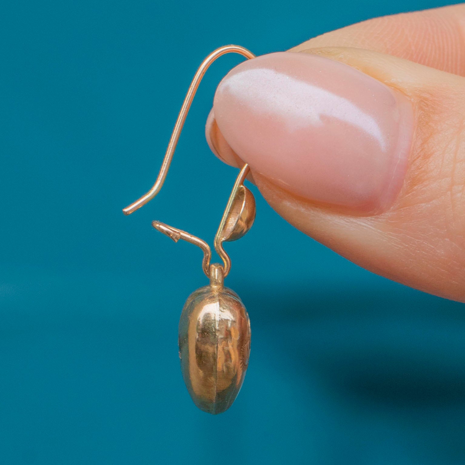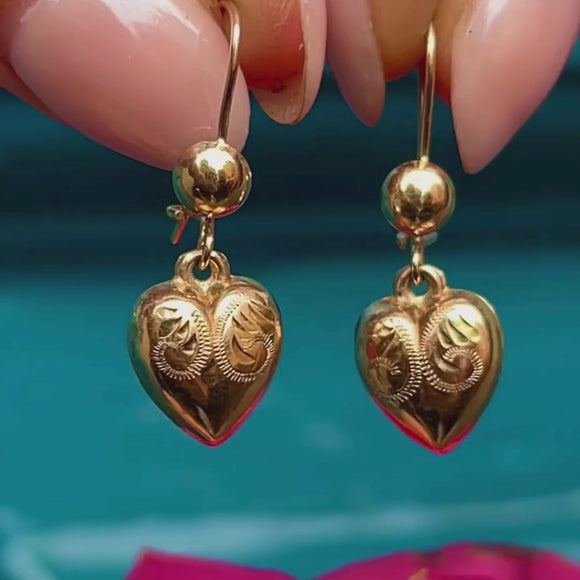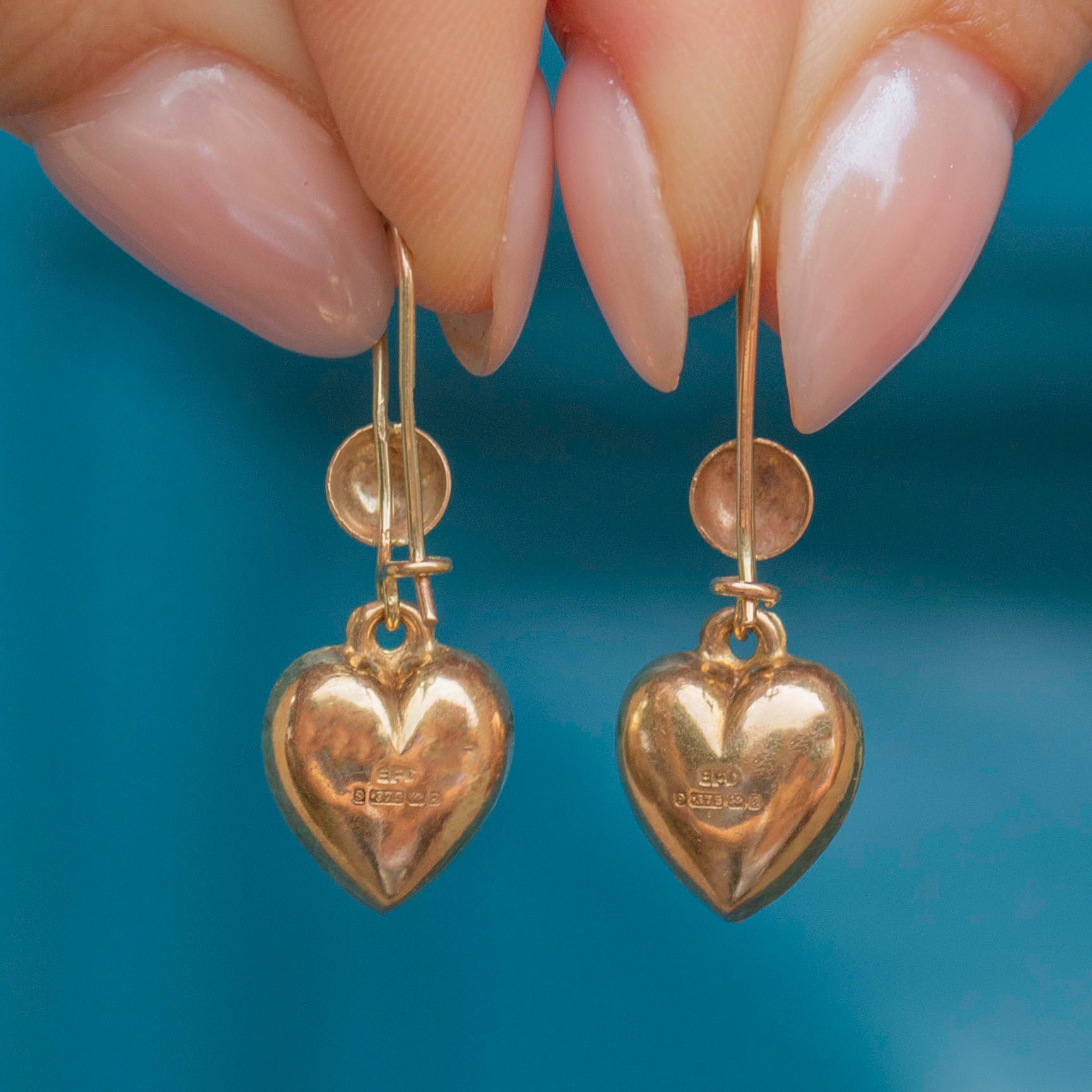 EXCELLENT. These Vintage 9ct Gold puffy heart drop earrings are in excellent condition. The 9ct Gold is warm and radiant, with crisp and clear engravings. Hallmarks are present on the back, dating these Vintage heart earrings to 1965. Totally irresistible, we have fallen in love with these Vintage heart earrings!