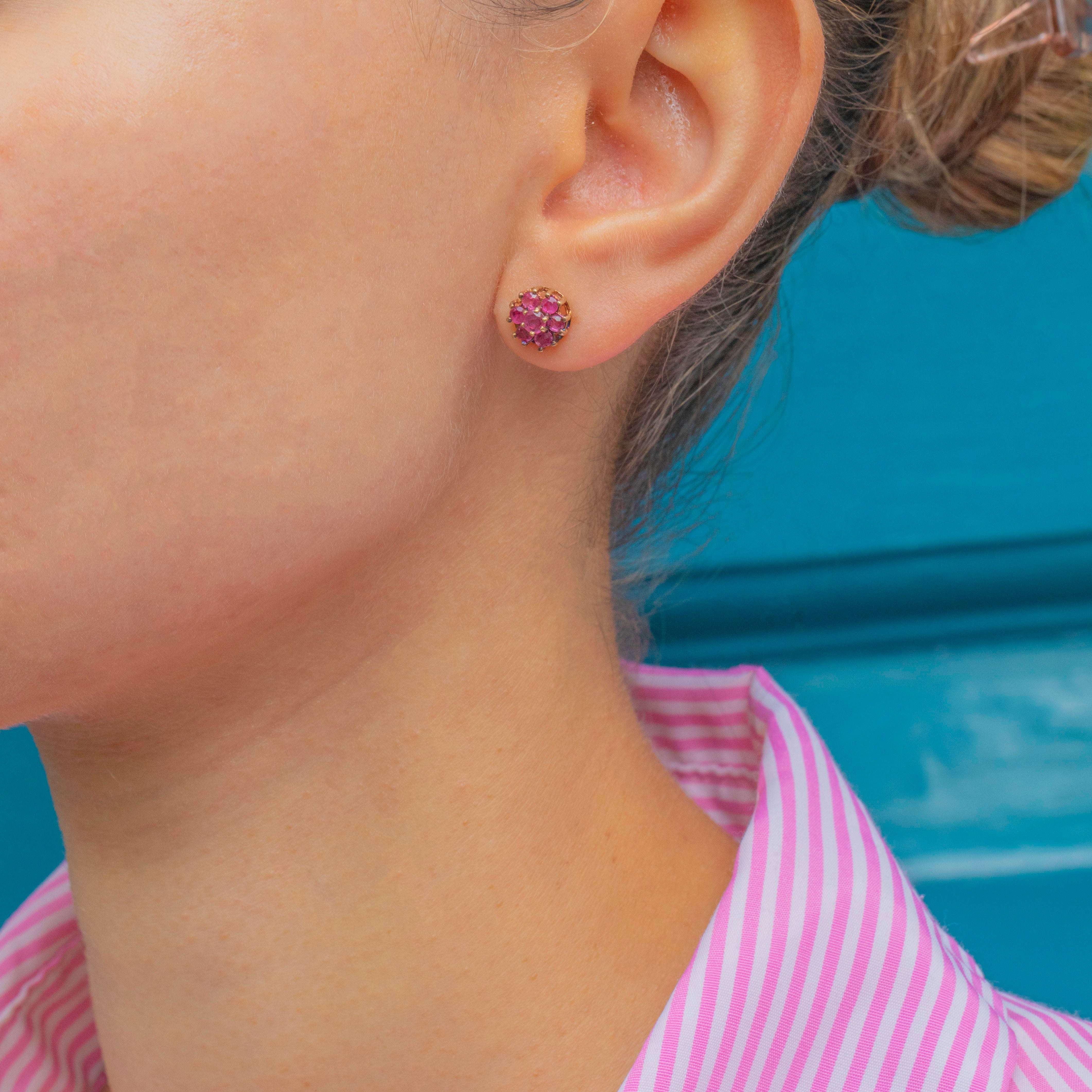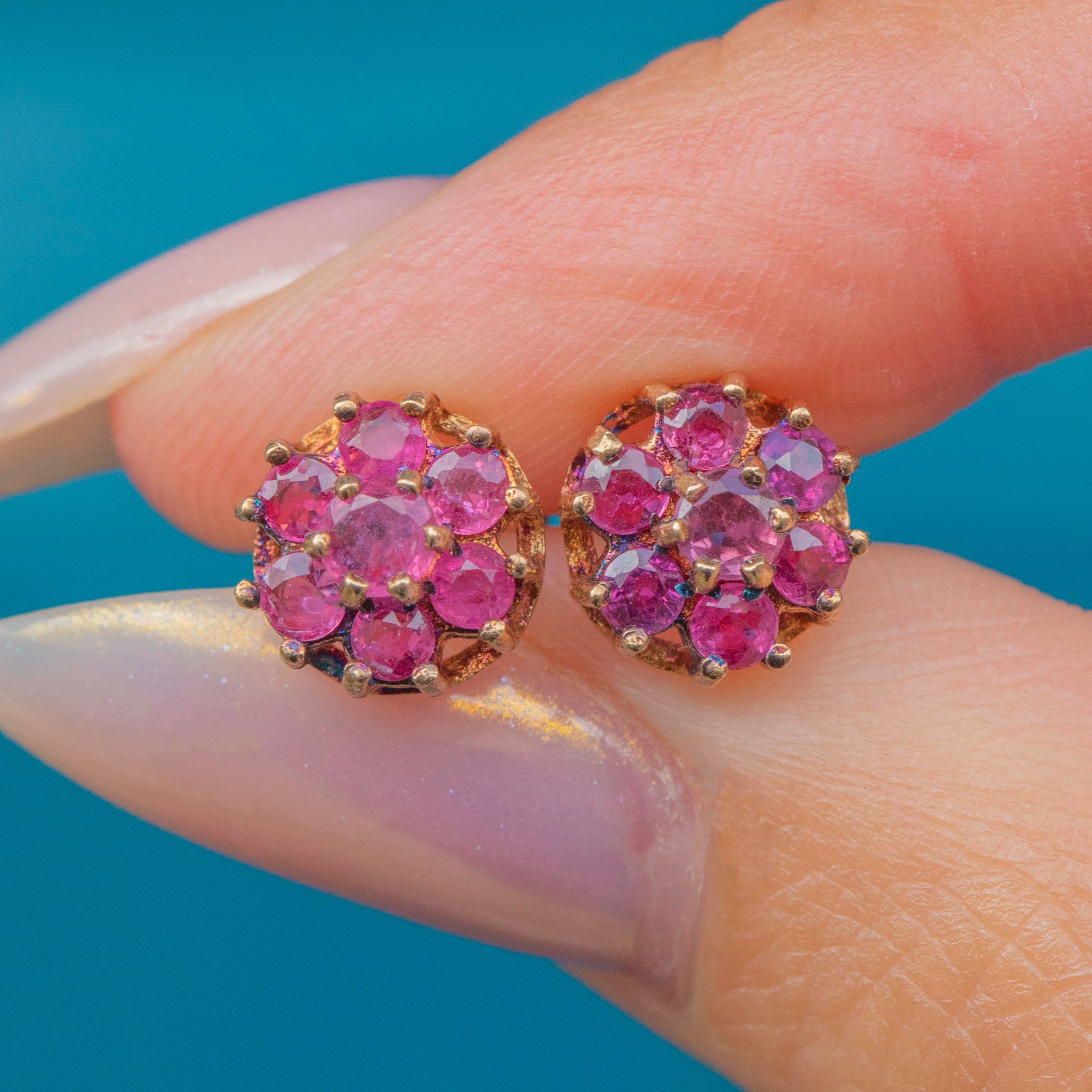 A pair of vibrant Vintage 9ct Gold Ruby Cluster stud earrings, c.1980s, featuring clusters of well-matched Rubies.