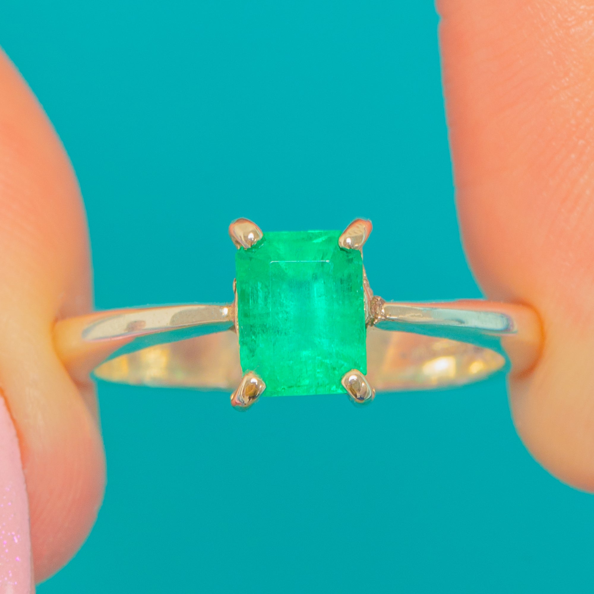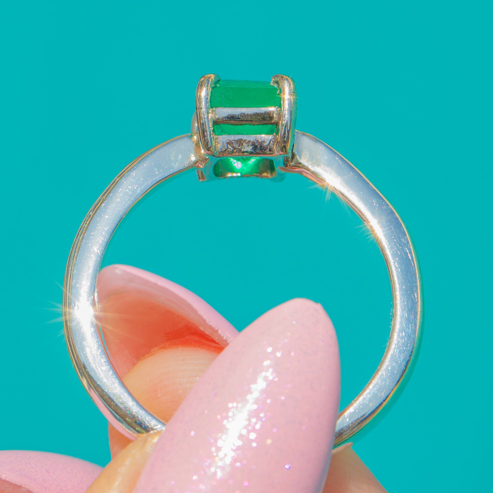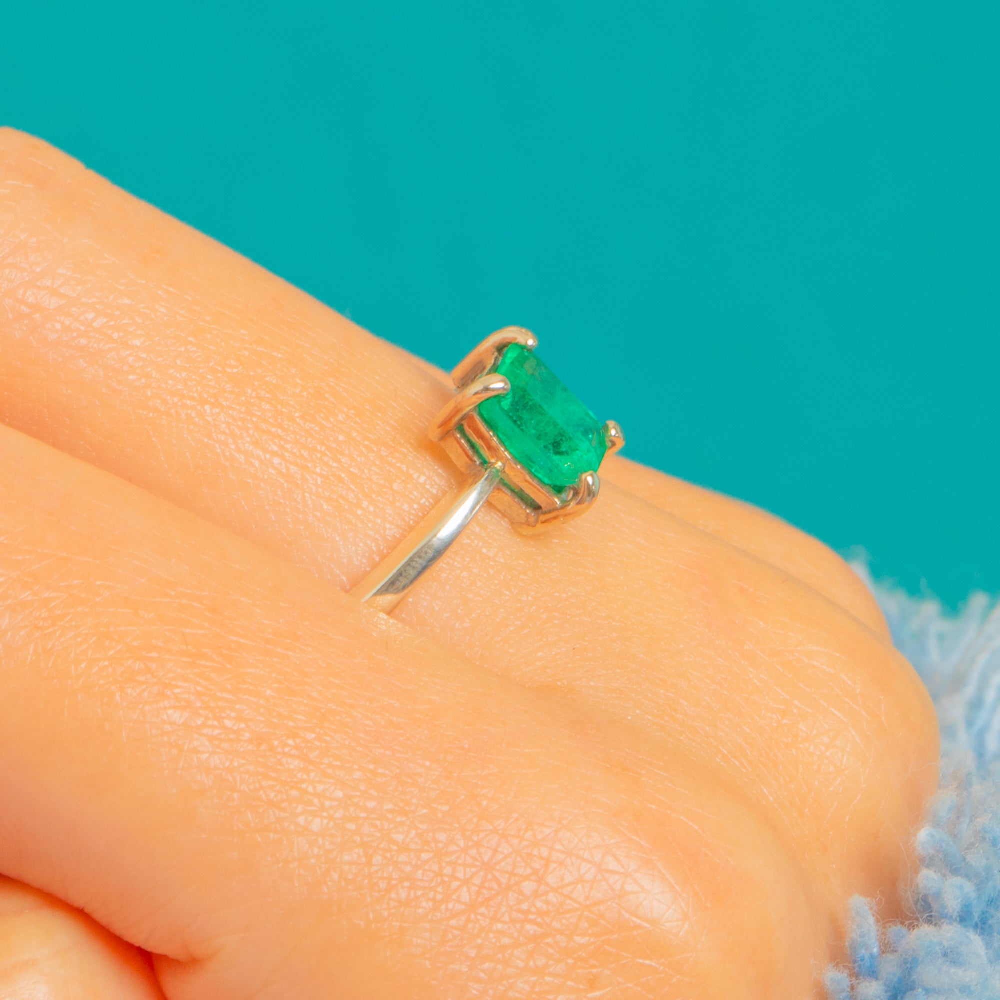 A timeless Emerald solitaire with crisp, architectural poise. The 1.02ct emerald-cut Emerald sits neatly in a four-claw basket with an open gallery, its step facets drawing the eye to that beautiful green glow. Sleek and minimalist, the clean lines let the gemstone take centre stage.
