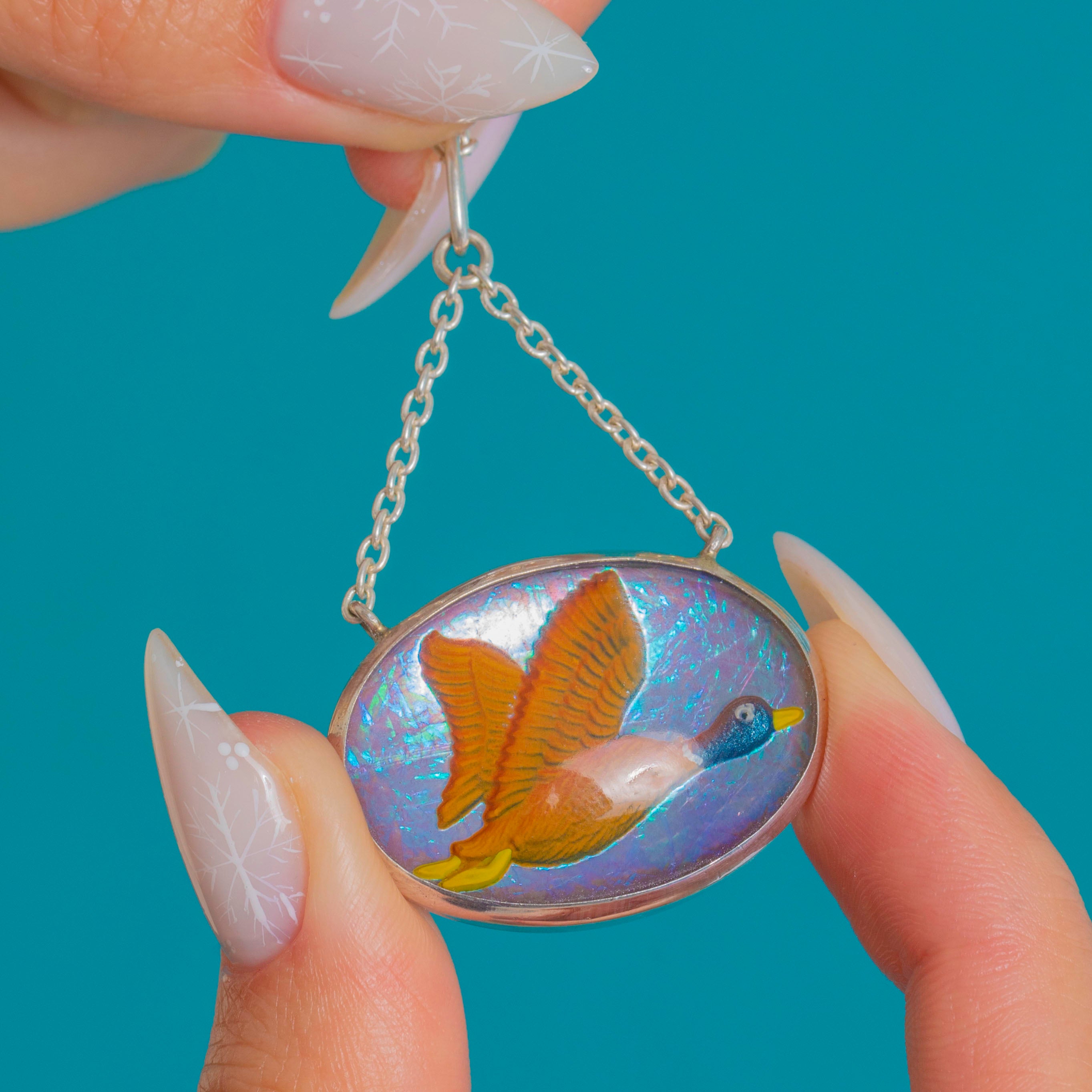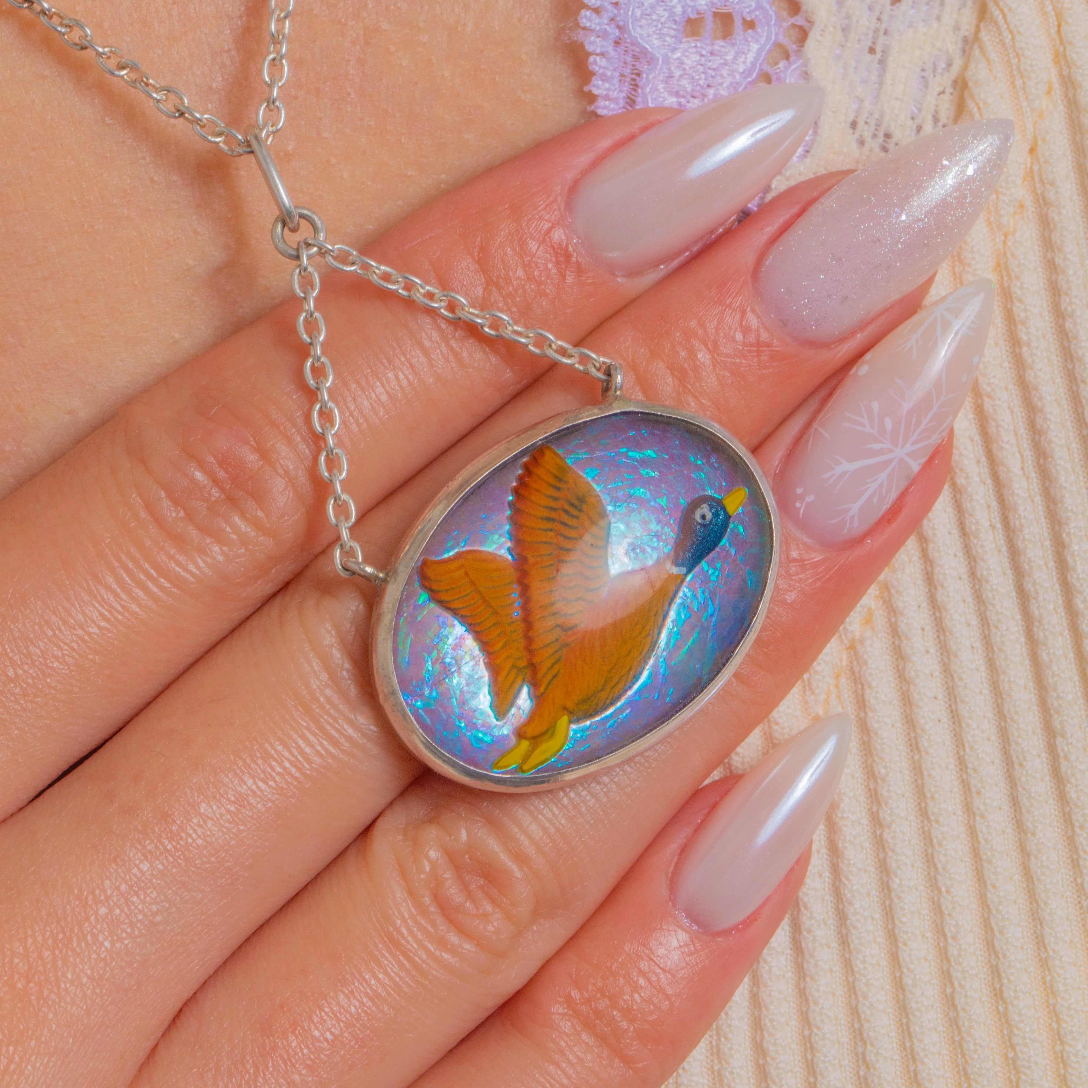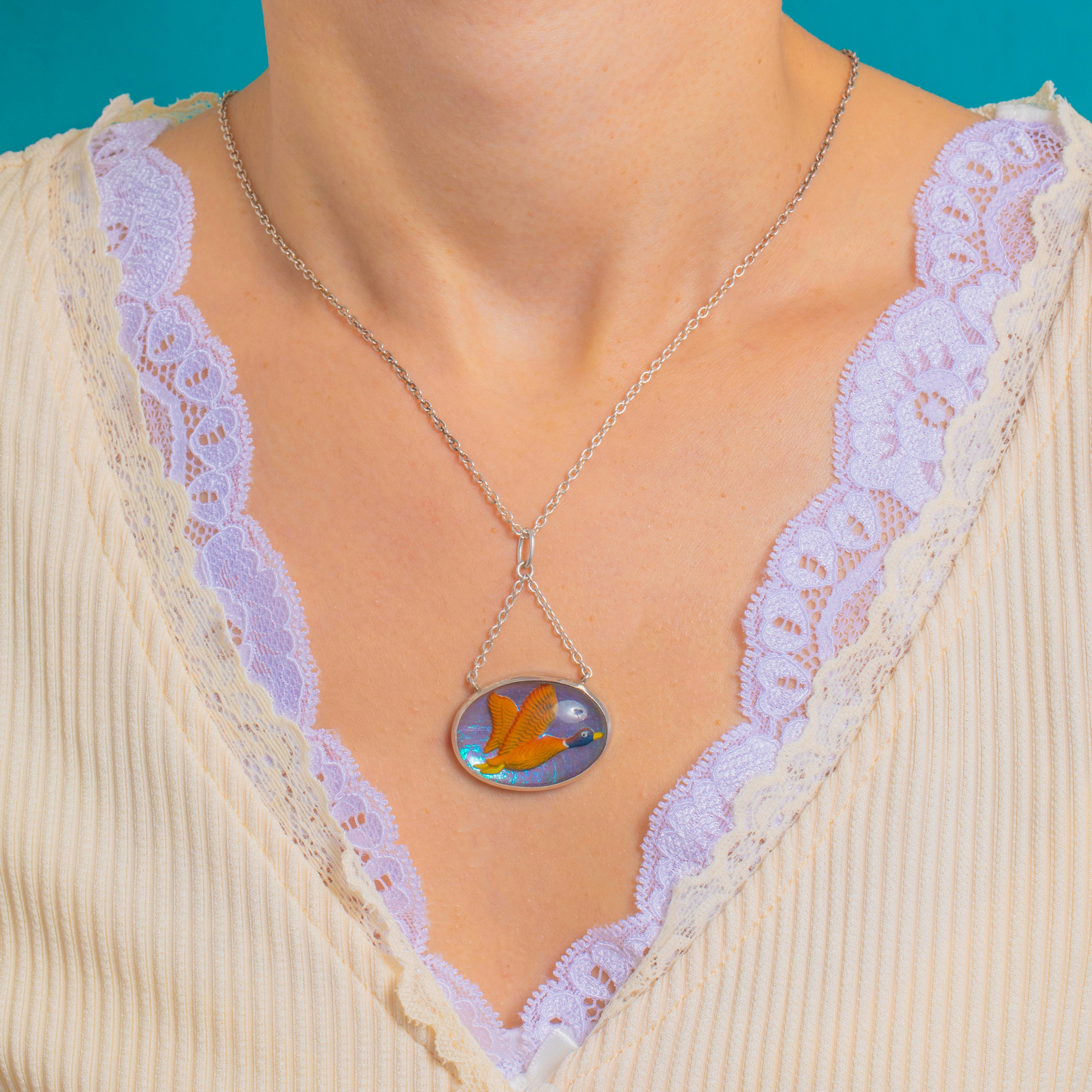 A charming reverse-carved and painted pendant necklace featuring a vivid bird in flight, its colours dancing over an iridescent blue-lilac backdrop. The clear domed resin cabochon is neatly framed by a smooth Silver rub-over bezel, creating a luminous window that feels both delicate and distinctive.