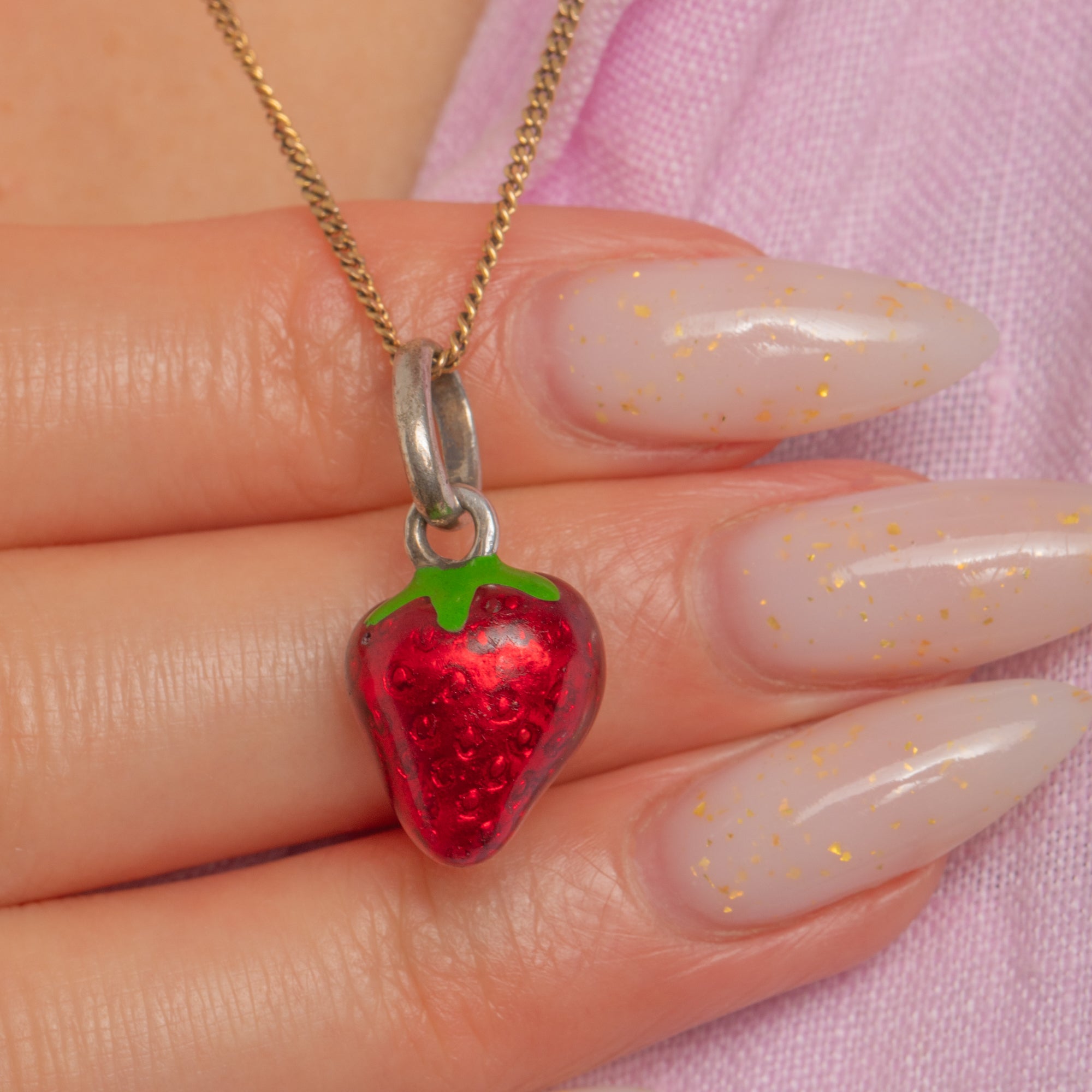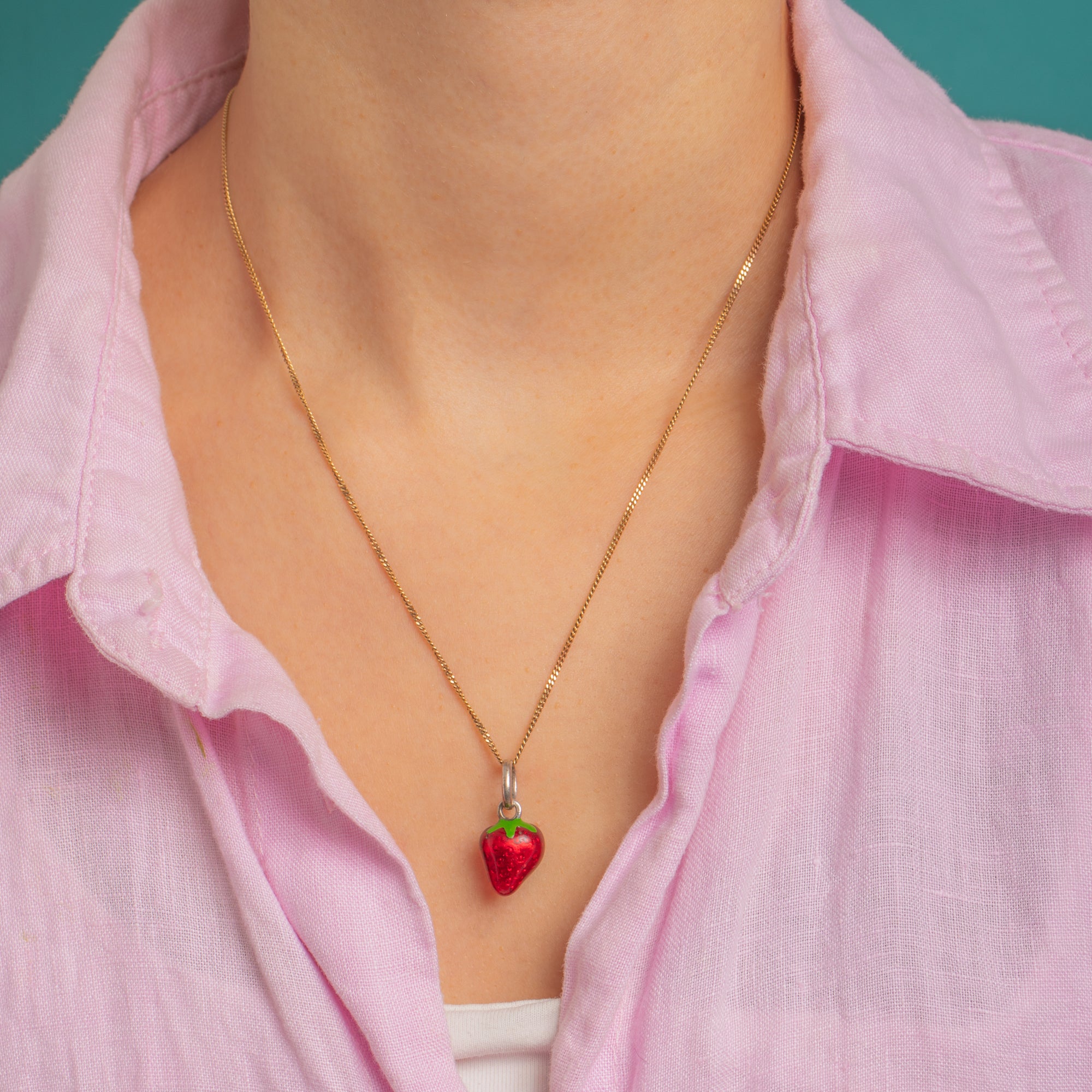 Sleek, sweet and oh‑so‑charming, this mid-century strawberry charm is crafted in Sterling Silver and finished with glossy translucent red Enamel, dimpled like seeds and crowned by a bright green calyx. Its petite, sculptural form has delightful presence, bringing a playful pop of colour with a refined, high-shine finish.