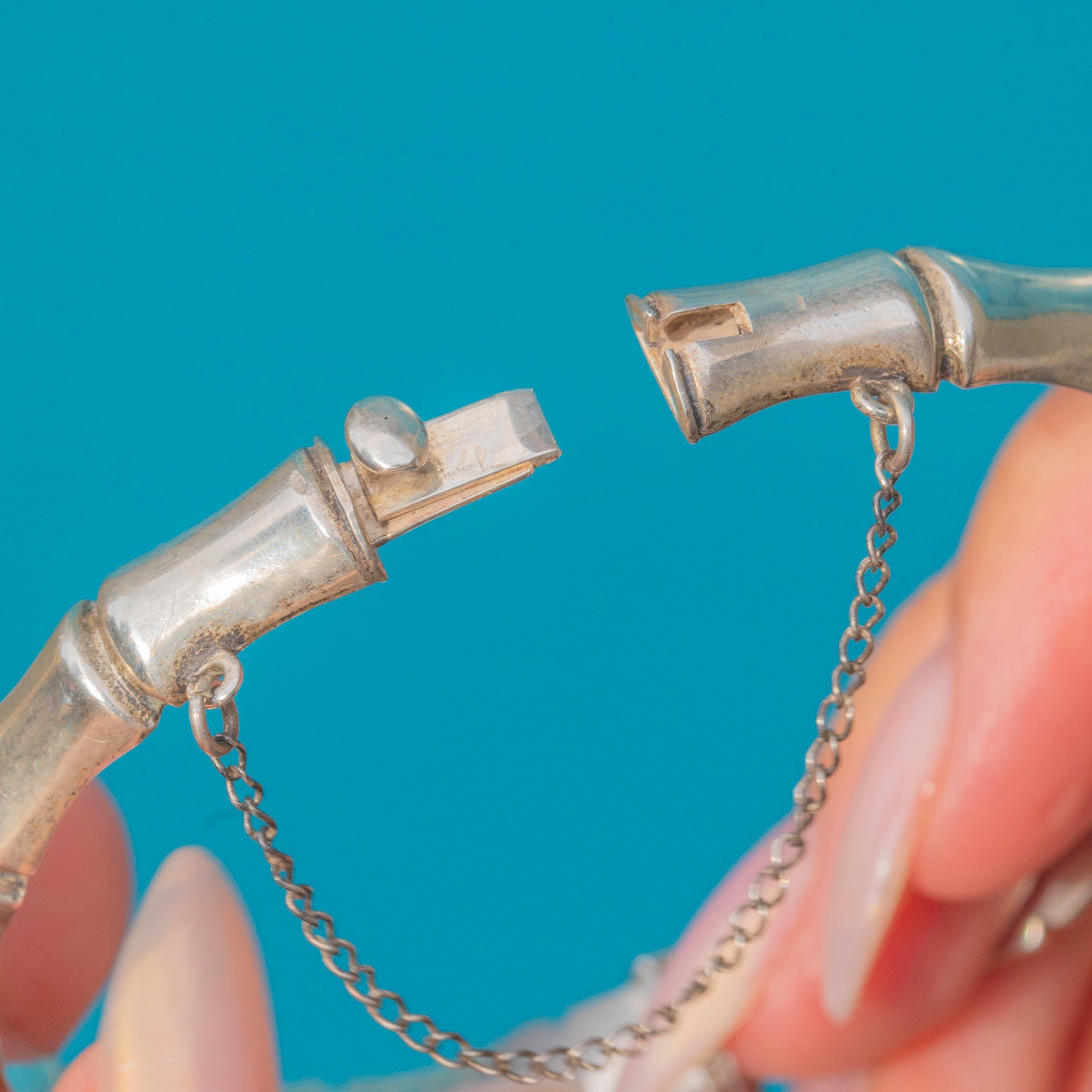 EXCELLENT: The bangle is in superb condition with no noticeable dents or damage. The hinge and clasp are strong and secure, and the safety chain remains intact. The Sterling Silver has been well cared for, retaining a bright polish with only light surface wear consistent with age.