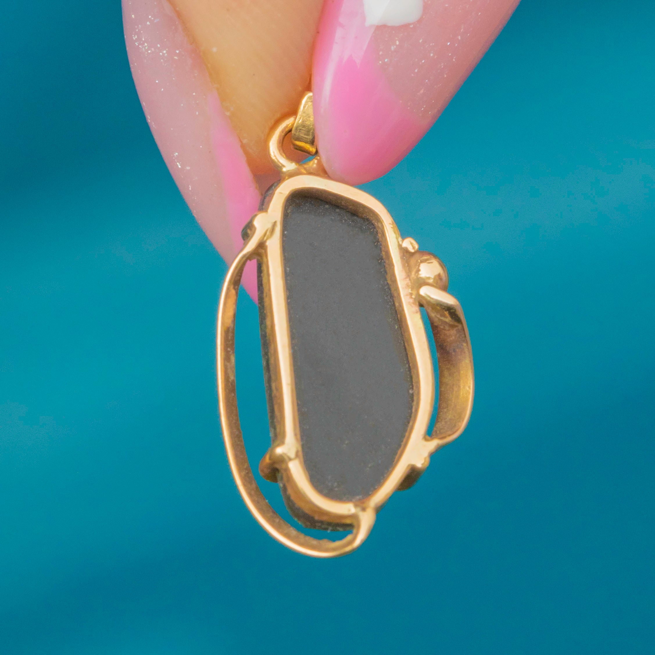 This striking pendant showcases a vivid Opal triplet bursting with electric flashes of blue, pink and green. The Opal’s dramatic play-of-colour is beautifully enhanced by its sculptural 9ct Gold setting, complete with decorative side detailing that flows around the gem like liquid Gold.