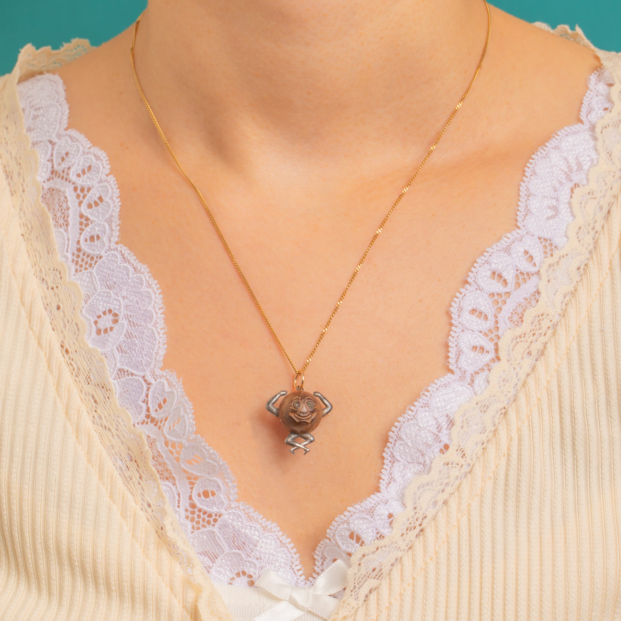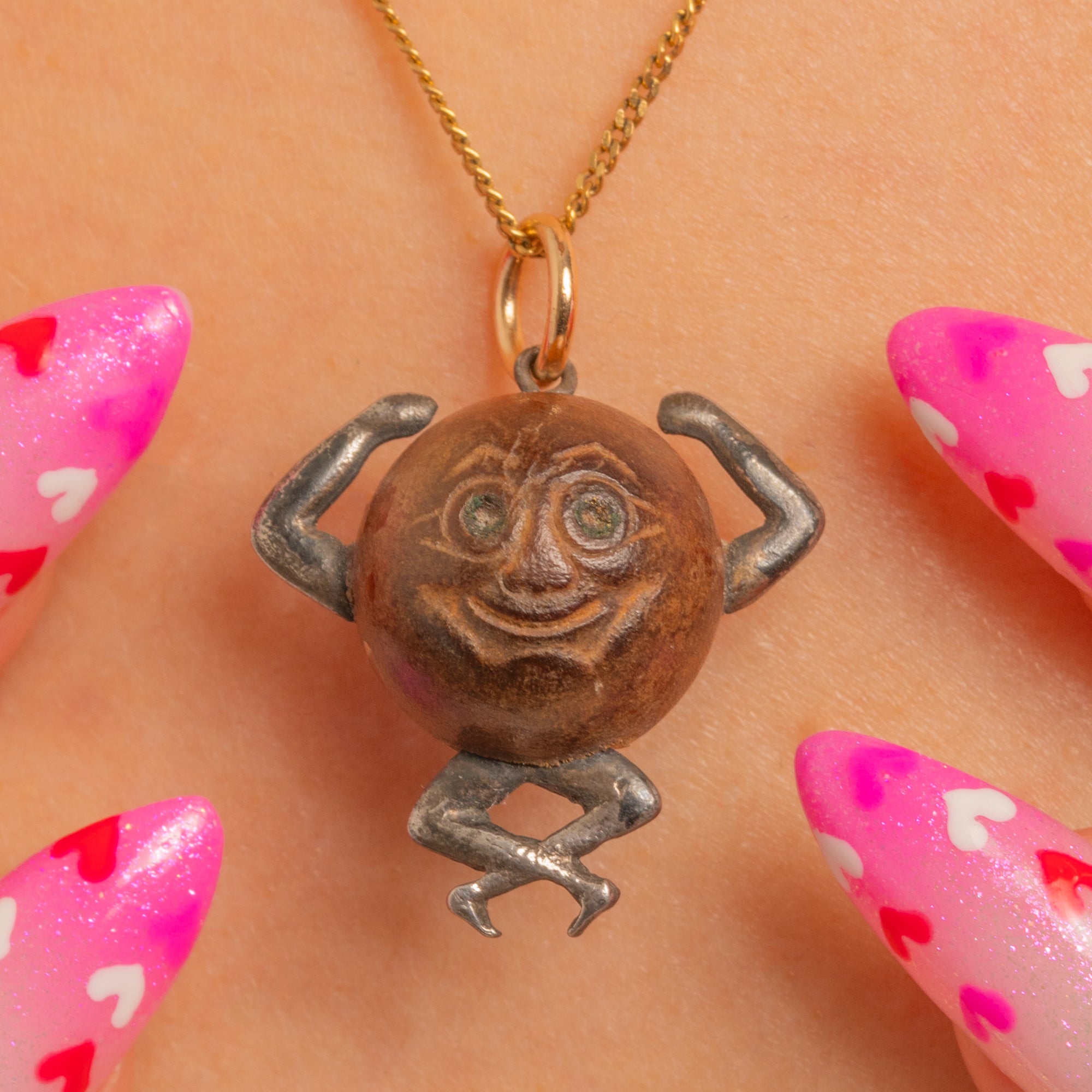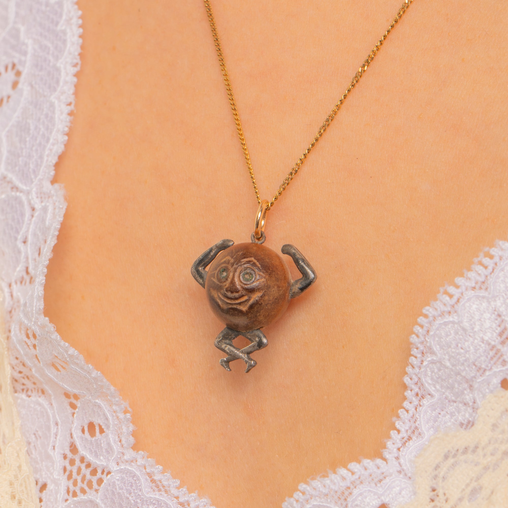 Warm with age and character, the wooden head is paired with a 9ct Gold jump ring for a subtle glint of luxury. A delightful piece brimming with the whimsy and heart of its time.
