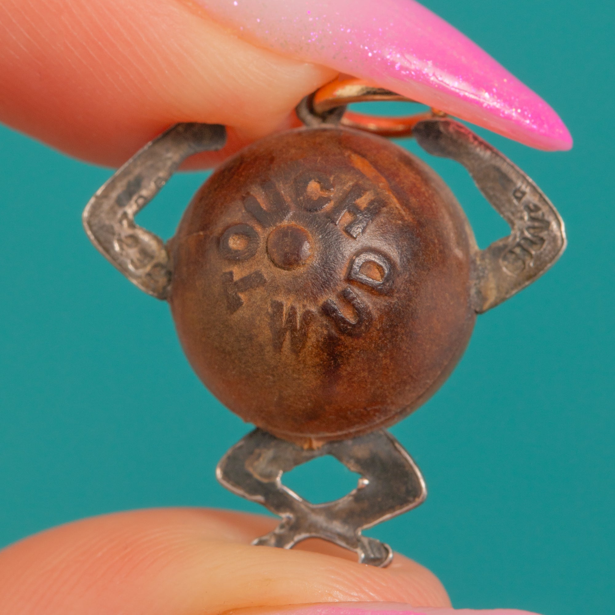 A charming World War I era “Tommy Touch Wud” fumsup good luck charm, crafted with Sterling Silver arms and legs and a smiling Wood orb. Playful yet steeped in sentiment, this figural pendant captures the quintessential wartime talisman—raised hands giving the “thumb’s up” and “Touch Wud” embossed to the back for luck.